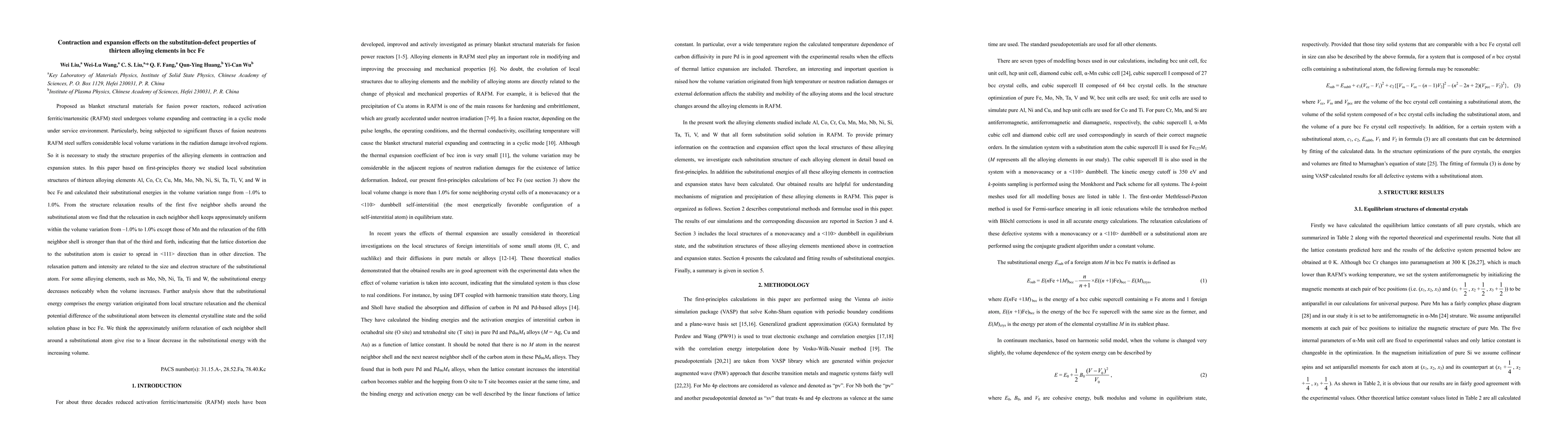 Proposed as blanket structural materials for fusion power reactors, reduced activation ferritic/martensitic (RAFM) steel undergoes volume expanding and contracting in a cyclic mode under service environment. Particularly, being subjected to significant fluxes of fusion neutrons RAFM steel suffers considerable local volume variations in the radiation damage involved regions. It is necessary to study the structure properties of the alloying elements in contraction and expansion states. In this paper we studied local substitution structures of thirteen alloying elements Al, Co, Cr, Cu, Mn, Mo, Nb, Ni, Si, Ta, Ti, V, and W in bcc Fe and calculated their substitutional energies in the volume variation range from -1.0% to 1.0%. From the structure relaxation results of the first five neighbor shells around the substitutional atom we find the relaxation in each neighbor shell keeps approximately uniform within the volume variation from -1.0% to 1.0% except those of Mn and the relaxation of the fifth neighbor shell is stronger than that of the third and forth, indicating that the lattice distortion due to the substitution atom is easier to spread in <111> direction than in other direction. The relaxation pattern and intensity are related to the size and electron structure of the substitutional atom. For some alloying elements, such as Mo, Nb, Ni, Ta, Ti and W, the substitutional energy decreases noticeably when the volume increases. Further analysis show that the substitutional energy comprises the energy variation originated from local structure relaxation and the chemical potential difference of the substitutional atom between its elemental crystalline state and the solid solution phase in bcc Fe. We think the approximately uniform relaxation of each neighbor shell around a substitutional atom give rise to a linear decrease in the substitutional energy with the increasing volume.