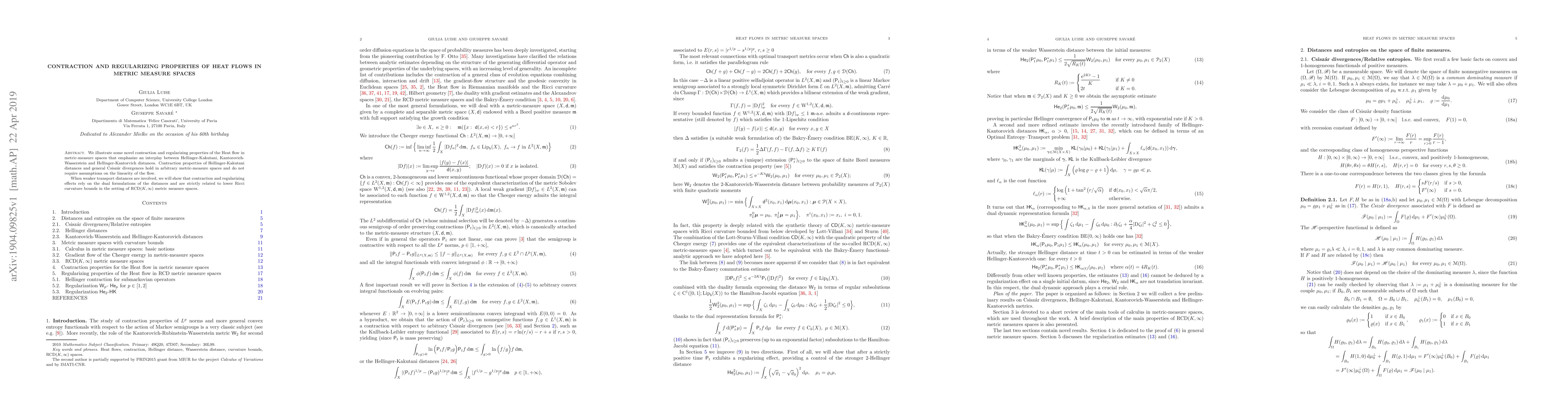This paper explores the contraction and regularizing properties of heat flows in metric-measure spaces, highlighting the interplay between Hellinger-Kakutani, Kantorovich-Wasserstein, and Hellinger-Kantorvich distances. It demonstrates that contraction properties hold for Hellinger-Kakutani distances and general Csiszár divergences in any metric-measure space, while regularizing effects under weaker transport distances are linked to lower Ricci curvature bounds.