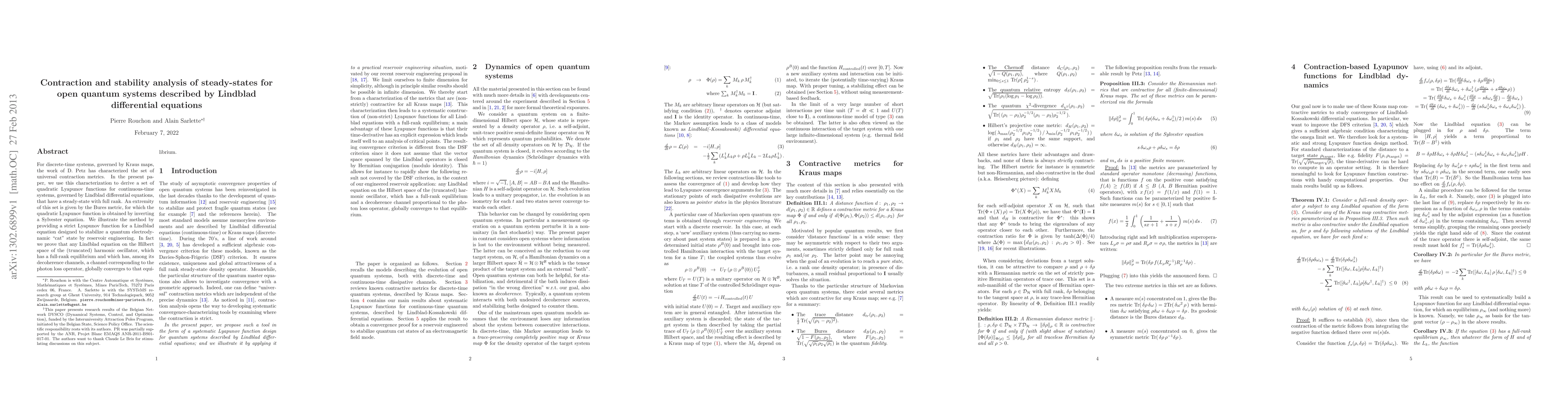 For discrete-time systems, governed by Kraus maps, the work of D. Petz has characterized the set of universal contraction metrics. In the present paper, we use this characterization to derive a set of quadratic Lyapunov functions for continuous-time systems, governed by Lindblad differential equations, that have a steady-state with full rank. An extremity of this set is given by the Bures metric, for which the quadratic Lyapunov function is obtained by inverting a Sylvester equation. We illustrate the method by providing a strict Lyapunov function for a Lindblad equation designed to stabilize a quantum electrodynamic "cat" state by reservoir engineering. In fact we prove that any Lindblad equation on the Hilbert space of the (truncated) harmonic oscillator, which has a full-rank equilibrium and which has, among its decoherence channels, a channel corresponding to the photon loss operator, globally converges to that equilibrium.
