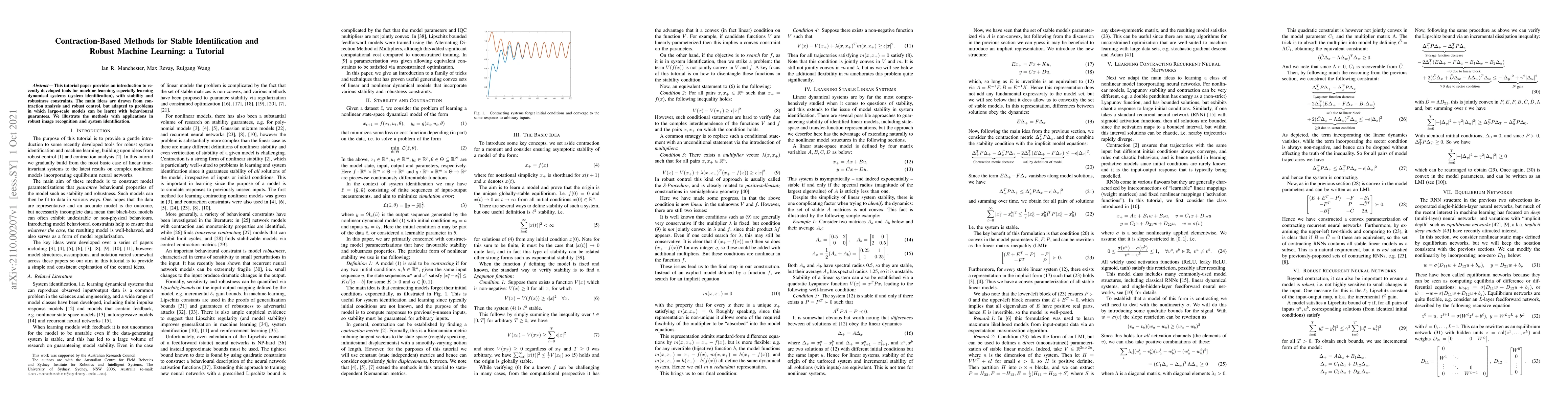 This tutorial paper provides an introduction to recently developed tools for machine learning, especially learning dynamical systems (system identification), with stability and robustness constraints. The main ideas are drawn from contraction analysis and robust control, but adapted to problems in which large-scale models can be learnt with behavioural guarantees. We illustrate the methods with applications in robust image recognition and system identification.