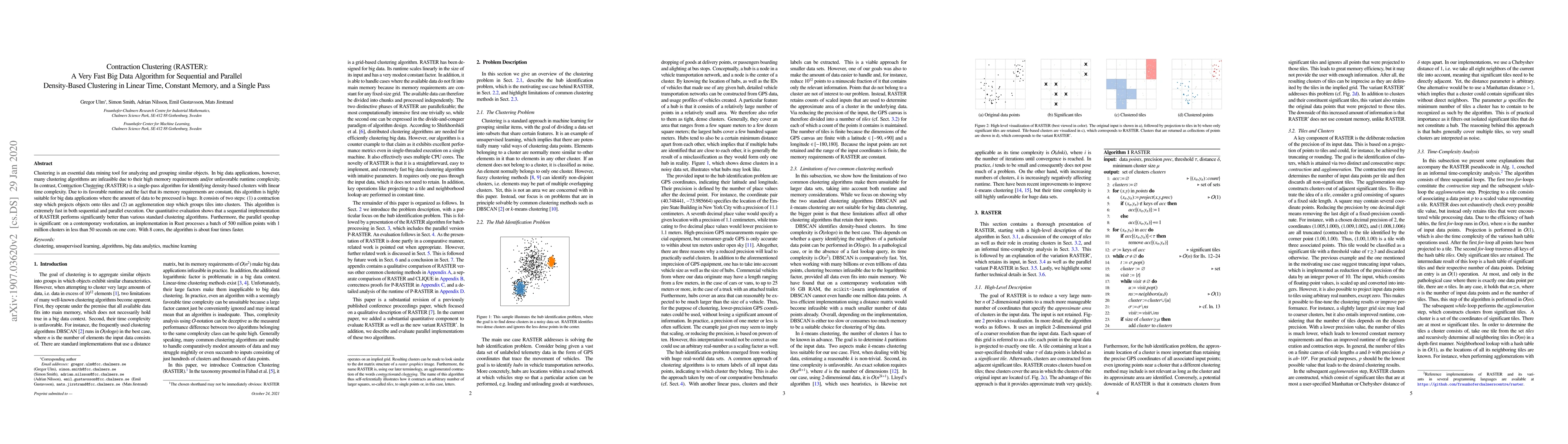 Clustering is an essential data mining tool for analyzing and grouping similar objects. In big data applications, however, many clustering algorithms are infeasible due to their high memory requirements and/or unfavorable runtime complexity. In contrast, Contraction Clustering (RASTER) is a single-pass algorithm for identifying density-based clusters with linear time complexity. Due to its favorable runtime and the fact that its memory requirements are constant, this algorithm is highly suitable for big data applications where the amount of data to be processed is huge. It consists of two steps: (1) a contraction step which projects objects onto tiles and (2) an agglomeration step which groups tiles into clusters. This algorithm is extremely fast in both sequential and parallel execution. Our quantitative evaluation shows that a sequential implementation of RASTER performs significantly better than various standard clustering algorithms. Furthermore, the parallel speedup is significant: on a contemporary workstation, an implementation in Rust processes a batch of 500 million points with 1 million clusters in less than 50 seconds on one core. With 8 cores, the algorithm is about four times faster.