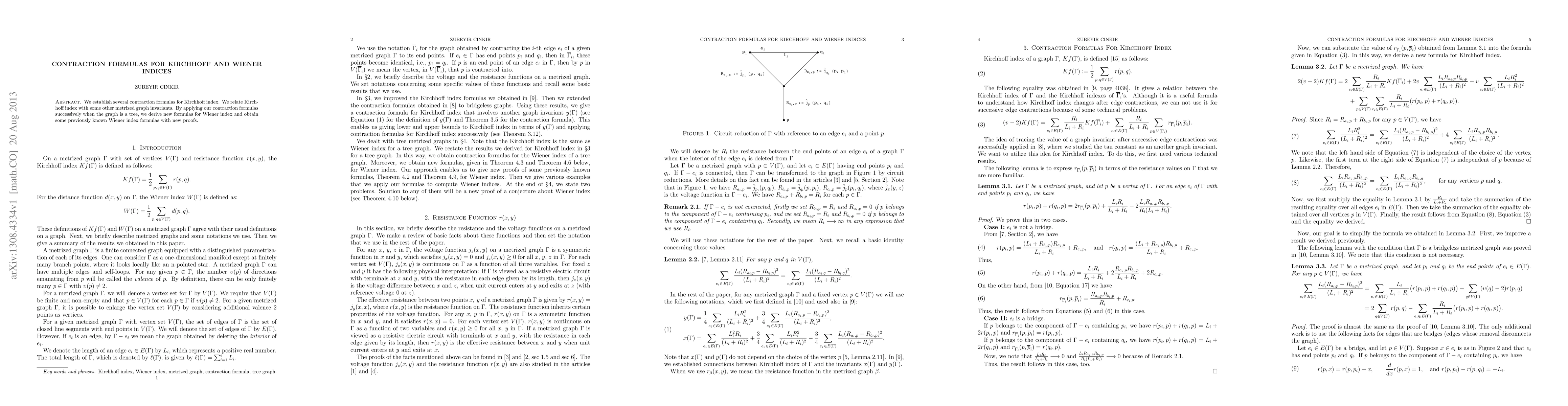 This paper establishes contraction formulas for the Kirchhoff index and relates it to other graph invariants. It also derives new formulas for the Wiener index by applying these contraction formulas to trees, providing new proofs for previously known formulas.