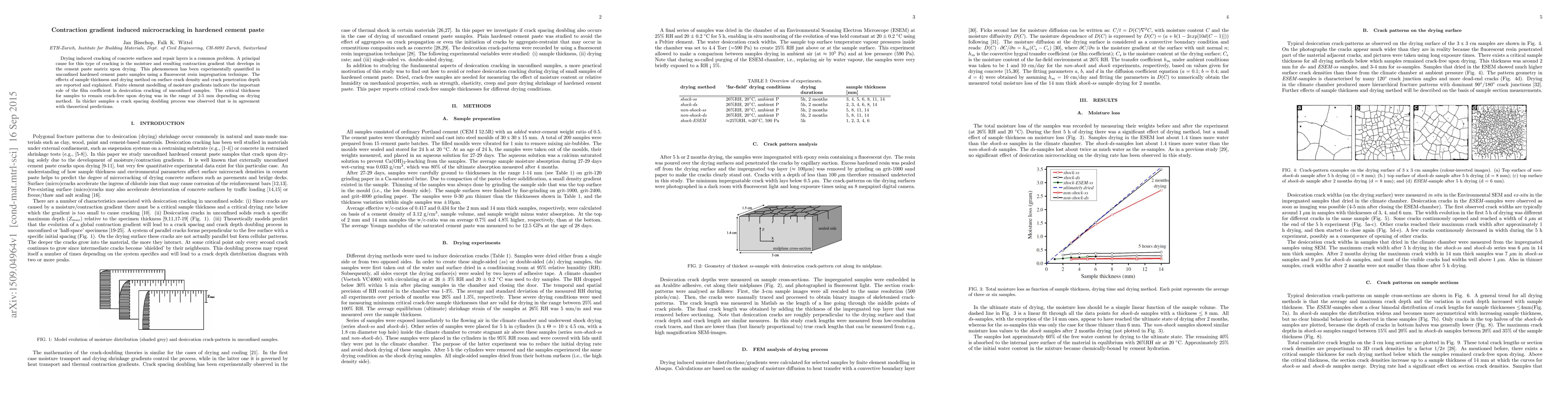 This study investigates the microcracking in hardened cement paste due to drying-induced contraction gradients, using fluorescent resin impregnation and finite element modelling. The research finds that sample thickness and drying method significantly affect crack density and depth, with a critical thickness of 2-5 mm for crack-free drying, and thicker samples exhibiting a doubling crack spacing pattern.