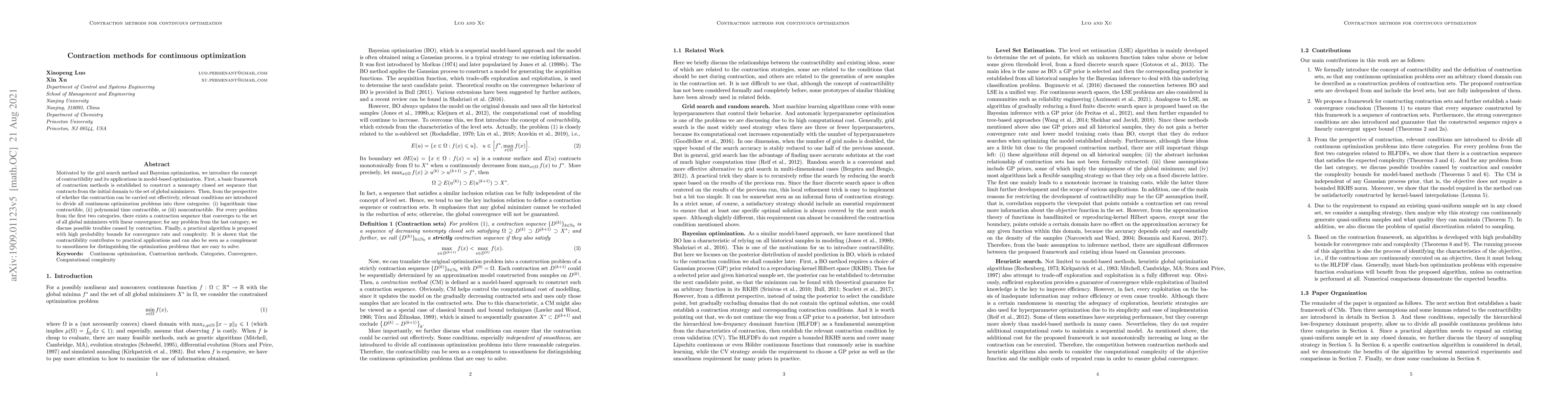 Motivated by the grid search method and Bayesian optimization, we introduce the concept of contractibility and its applications in model-based optimization. First, a basic framework of contraction methods is established to construct a nonempty closed set sequence that contracts from the initial domain to the set of global minimizers. Then, from the perspective of whether the contraction can be carried out effectively, relevant conditions are introduced to divide all continuous optimization problems into three categories: (i) logarithmic time contractible, (ii) polynomial time contractible, or (iii) noncontractible. For every problem from the first two categories, there exists a contraction sequence that converges to the set of all global minimizers with linear convergence; for any problem from the last category, we discuss possible troubles caused by contraction. Finally, a practical algorithm is proposed with high probability bounds for convergence rate and complexity. It is shown that the contractibility contributes to practical applications and can also be seen as a complement to smoothness for distinguishing the optimization problems that are easy to solve.