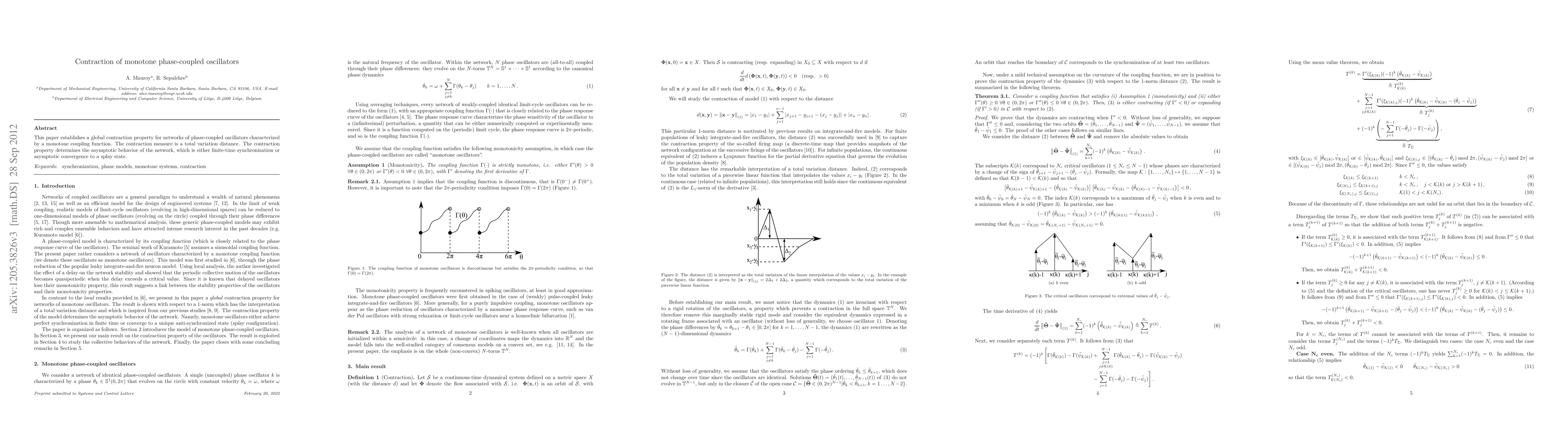 This paper proves a global contraction property for networks of monotone phase-coupled oscillators, showing that they either synchronize in finite time or converge asymptotically to a splay state, using a total variation distance as the contraction measure.