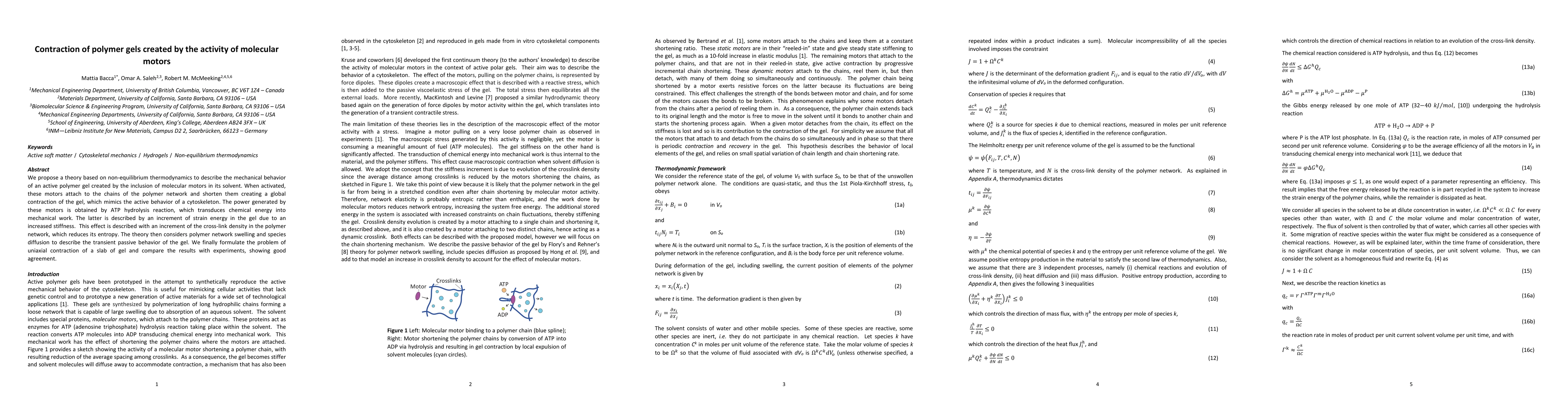 We propose a theory based on non-equilibrium thermodynamics to describe the mechanical behavior of an active polymer gel created by the inclusion of molecular motors in its solvent. When activated, these motors attach to the chains of the polymer network and shorten them creating a global contraction of the gel, which mimics the active behavior of a cytoskeleton. The power generated by these motors is obtained by ATP hydrolysis reaction, which transduces chemical energy into mechanical work. The latter is described by an increment of strain energy in the gel due to an increased stiffness. This effect is described with an increment of the cross-link density in the polymer network, which reduces its entropy. The theory then considers polymer network swelling and species diffusion to describe the transient passive behavior of the gel. We finally formulate the problem of uniaxial contraction of a slab of gel and compare the results with experiments, showing good agreement.