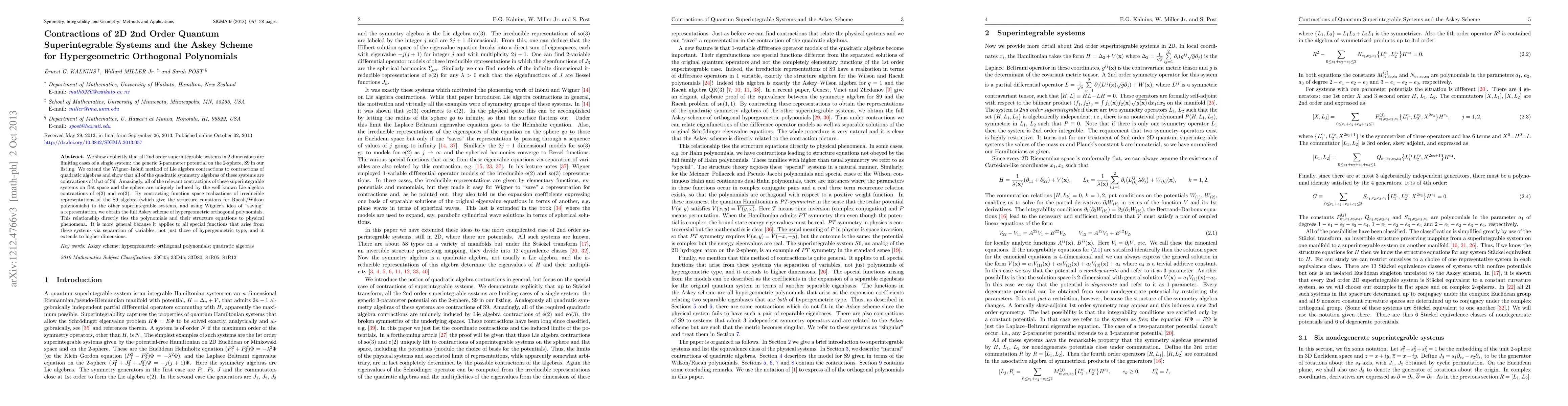 This paper demonstrates that all 2D second-order quantum superintegrable systems are contractions of a single 3-parameter potential on the 2-sphere. It connects these systems to the Askey scheme via Lie algebra contractions, revealing a deep link between hypergeometric orthogonal polynomials and physical phenomena.