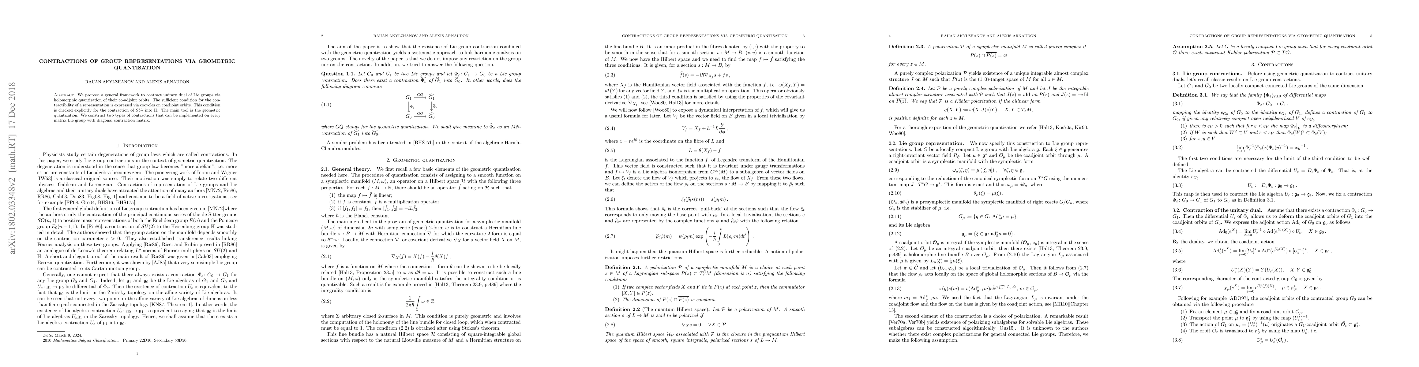 We propose a general framework to contract unitary dual of Lie groups via holomorphic quantization of their co-adjoint orbits. The sufficient condition for the contractability of a representation is expressed via cocycles on coadjoint orbits. This condition is checked explicitly for the contraction of ${\mathrm SU}_2$ into $\mathbb{H}$. The main tool is the geometric quantization. We construct two types of contractions that can be implemented on every matrix Lie group with diagonal contraction matrix.