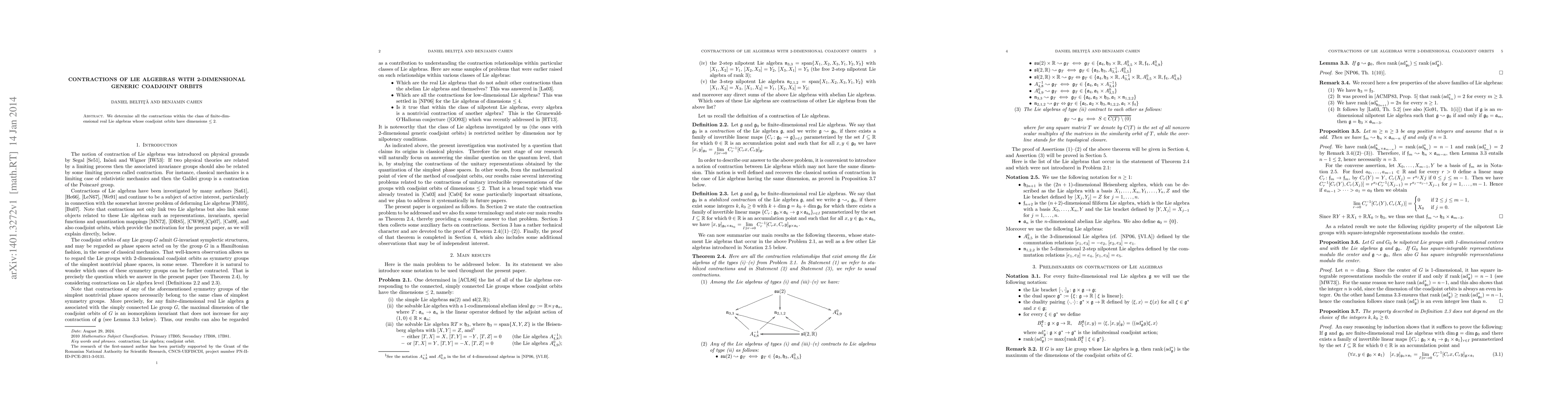 The research determines all contractions within the class of finite-dimensional real Lie algebras whose coadjoint orbits have dimensions ≤2, studying specific cases like su(2) → h3 and sl(2,R) contractions in detail.