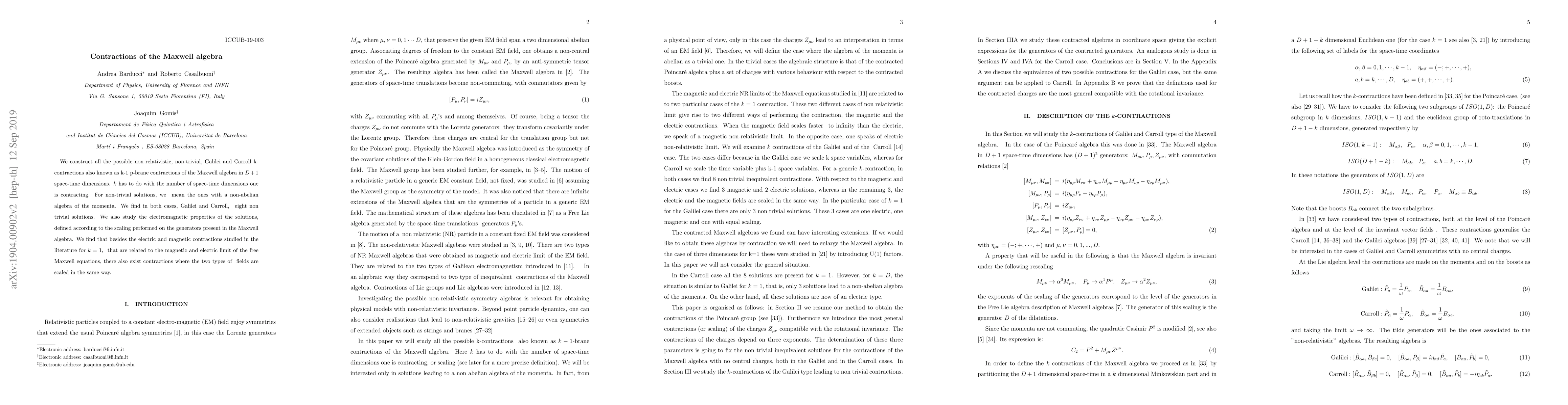 We construct all the possible non-relativistic, non-trivial, Galilei and Carroll k-contractions also known as k-1 p-brane contractions of the Maxwell algebra in $D+1$ space-time dimensions. $k$ has to do with the number of space-time dimensions one is contracting.