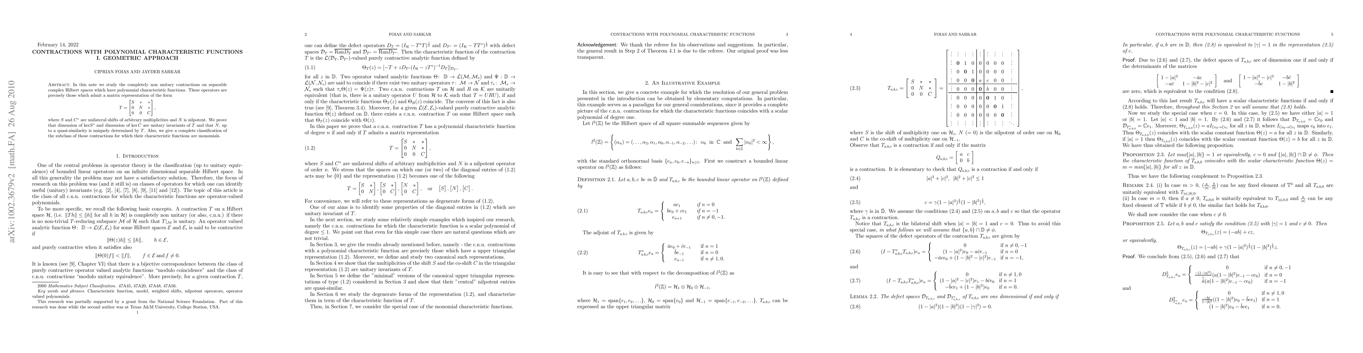 This paper studies completely non-unitary contractions in complex Hilbert spaces with polynomial characteristic functions, proving that the dimensions of certain kernels are unitary invariants and classifying contractions with monomial characteristic functions. It concludes that the nilpotent component, up to quasi-similarity, is uniquely determined by the contraction.