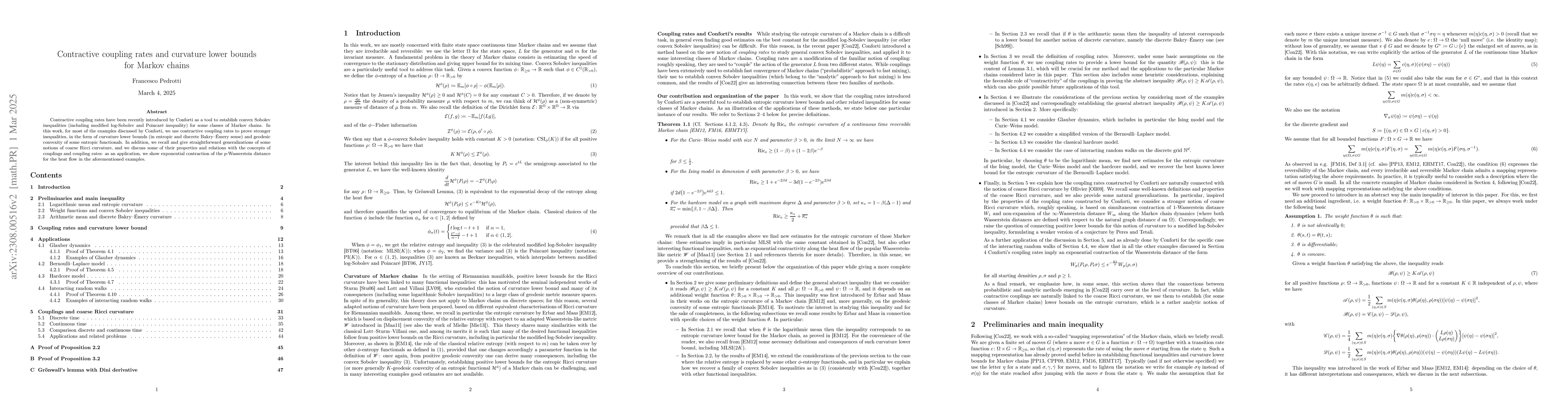 This paper explores the use of contractive coupling rates to establish curvature lower bounds and geodesic convexity for Markov chains, proving stronger inequalities and demonstrating positive curvature in entropic and Bakry-Émery senses. The study also generalizes coarse Ricci curvature notions and applies them to show exponential contraction in Wasserstein distances.