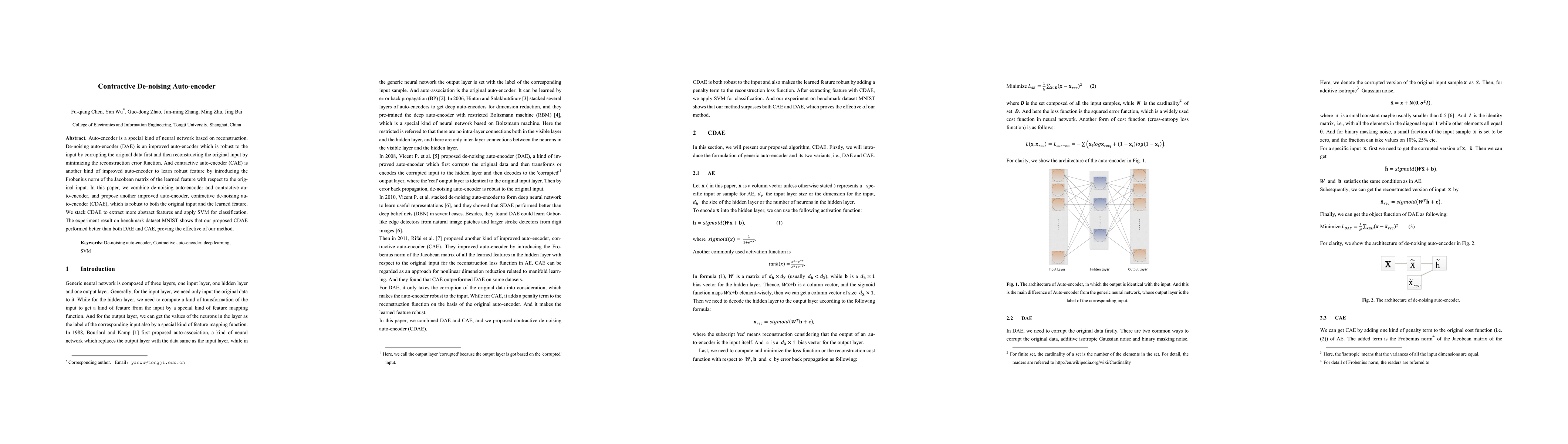 Auto-encoder is a special kind of neural network based on reconstruction. De-noising auto-encoder (DAE) is an improved auto-encoder which is robust to the input by corrupting the original data first and then reconstructing the original input by minimizing the reconstruction error function. And contractive auto-encoder (CAE) is another kind of improved auto-encoder to learn robust feature by introducing the Frobenius norm of the Jacobean matrix of the learned feature with respect to the original input. In this paper, we combine de-noising auto-encoder and contractive auto- encoder, and propose another improved auto-encoder, contractive de-noising auto- encoder (CDAE), which is robust to both the original input and the learned feature. We stack CDAE to extract more abstract features and apply SVM for classification. The experiment result on benchmark dataset MNIST shows that our proposed CDAE performed better than both DAE and CAE, proving the effective of our method.