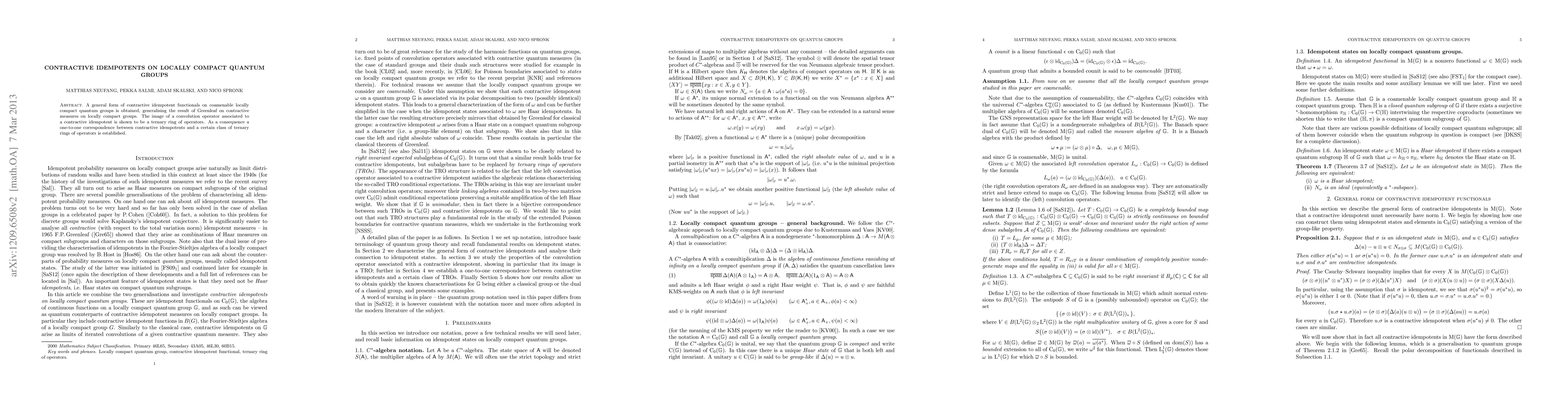 This paper derives contractive idempotent functionals for coamenable locally compact quantum groups, extending Greenleaf's work on contractive measures. It establishes a ternary ring of operators from the convolution operator associated with these idempotents, and proves a one-to-one correspondence between contractive idempotents and specific ternary rings.