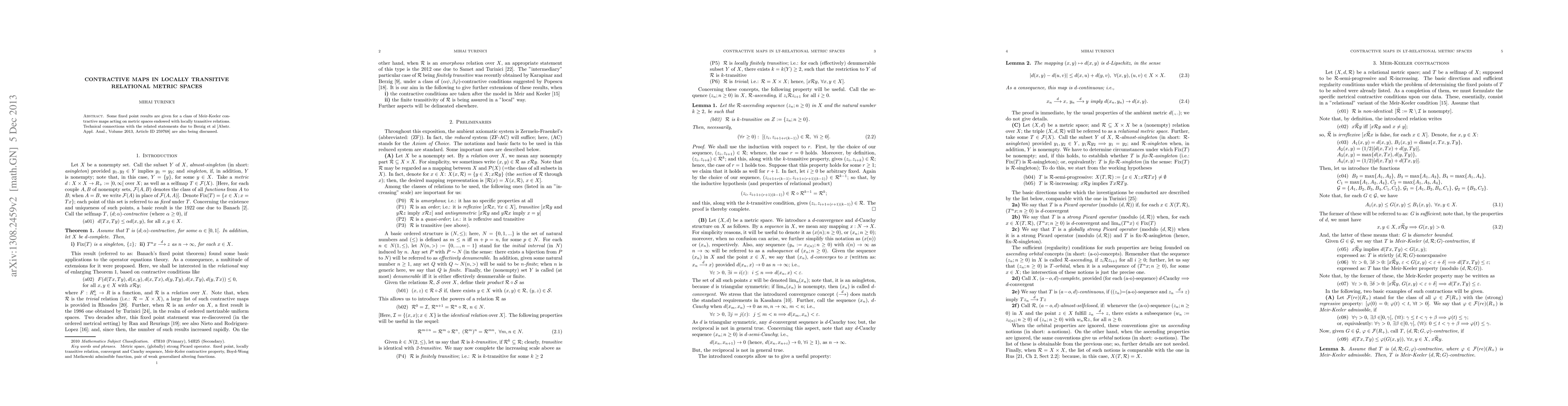 This paper presents fixed point results for Meir-Keeler contractive maps in locally transitive relational metric spaces, establishing technical connections with prior work by Berzig et al. The study extends the understanding of contractive maps within this novel relational framework.