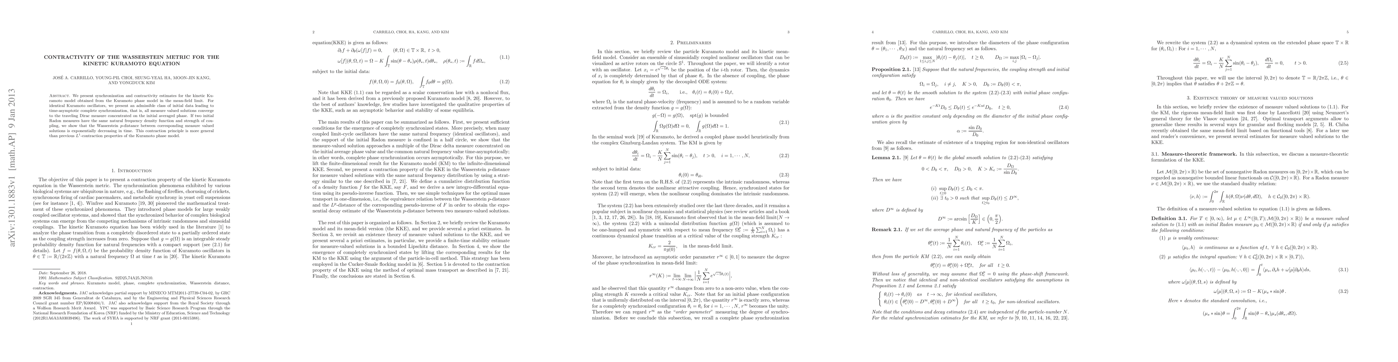We present synchronization and contractivity estimates for the kinetic Kuramoto model obtained from the Kuramoto phase model in the mean-field limit. For identical Kuramoto oscillators, we present an admissible class of initial data leading to time-asymptotic complete synchronization, that is, all measure valued solutions converge to the traveling Dirac measure concentrated on the initial averaged phase. If two initial Radon measures have the same natural frequency density function and strength of coupling, we show that the Wasserstein p-distance between corresponding measure valued solutions is exponentially decreasing in time. This contraction principle is more general than previous L1-contraction properties of the Kuramoto phase model.