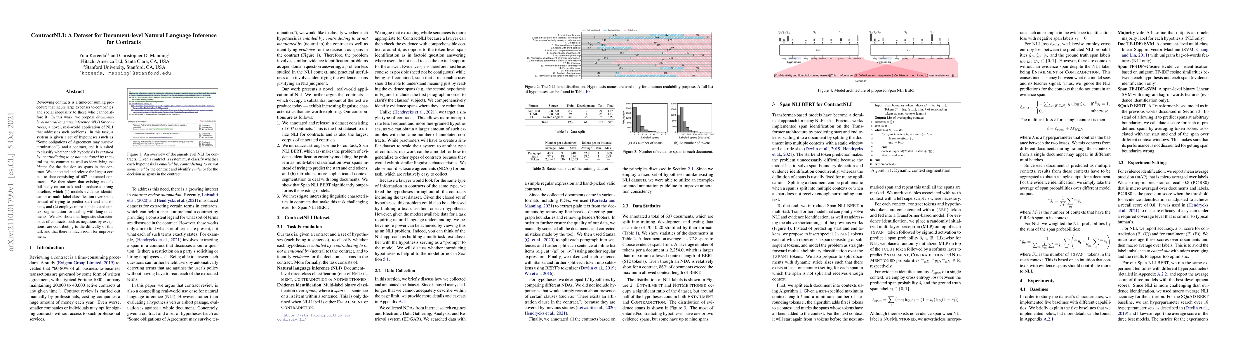 A new dataset called ContractNLI is released to help improve contract review efficiency and fairness. Existing models struggle with this task, but a strong baseline model is introduced that excels at identifying evidence in contracts.