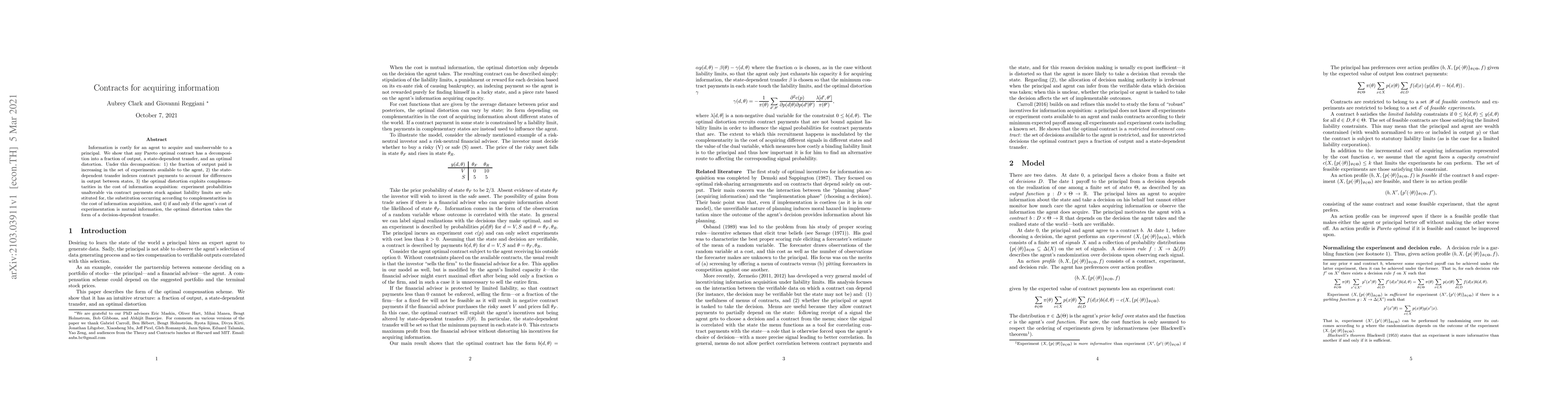 This research identifies the components of Pareto optimal contracts for information acquisition, including a fraction of output, state-dependent transfers, and optimal distortions. Key findings reveal that the fraction of output increases with available experiments, transfers adapt to output differences, and distortions exploit cost complementarities in information acquisition. Distortions specifically take the form of decision-dependent transfers when the agent's cost aligns with mutual information.