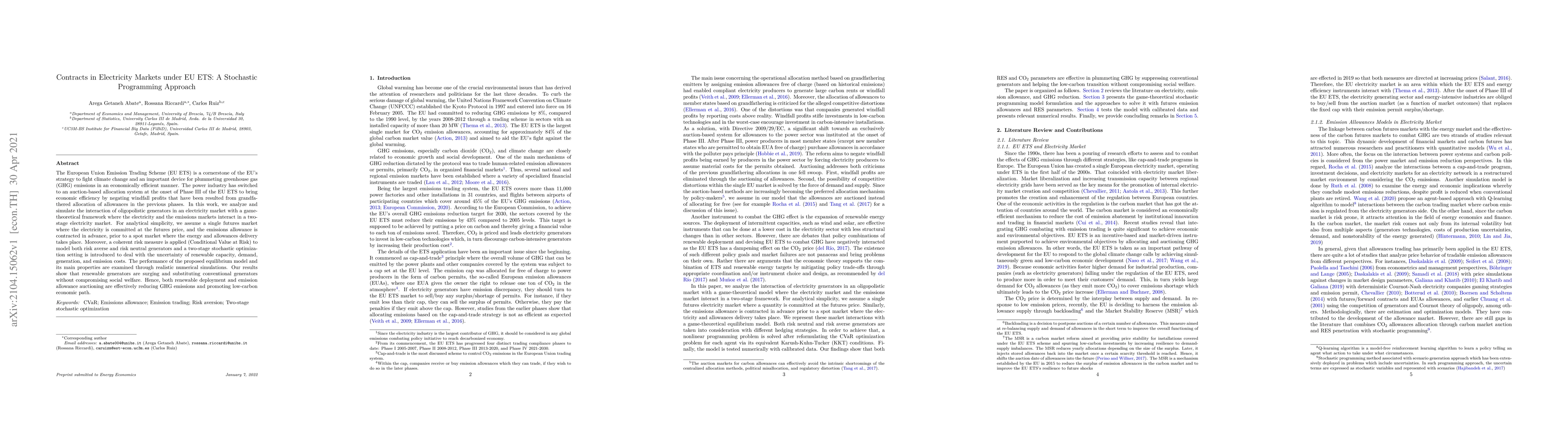 A study using stochastic programming and game theory analyzes EU ETS contracts in electricity markets, finding that renewable generators can substitute conventional ones without compromising social welfare.