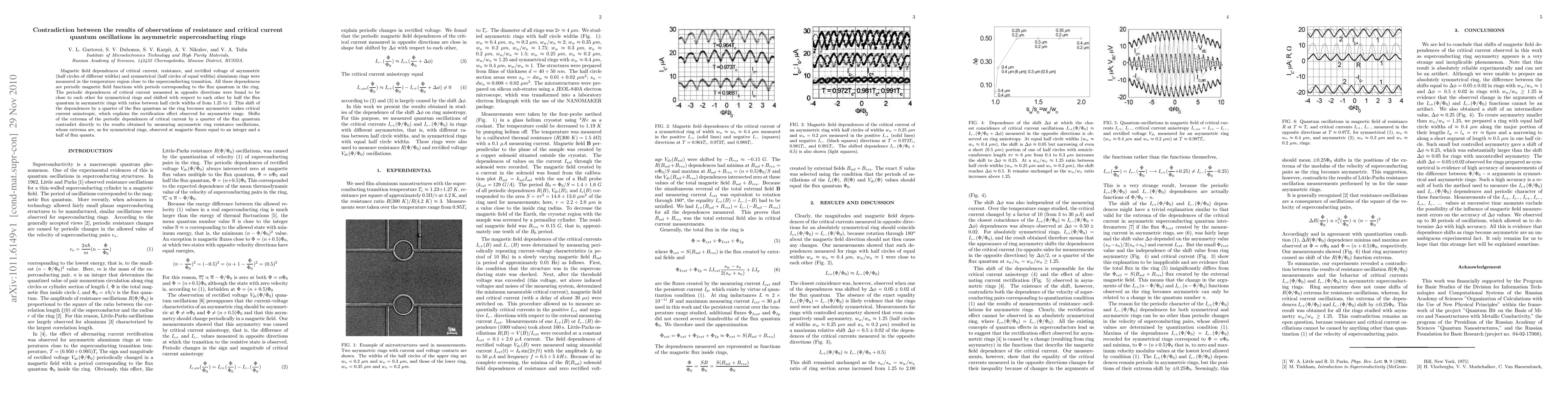 This study reveals a discrepancy in magnetic field dependences between critical current oscillations and resistance measurements in asymmetric superconducting rings, showing critical current shifts by a quarter flux quantum while resistance oscillations follow symmetrical patterns.