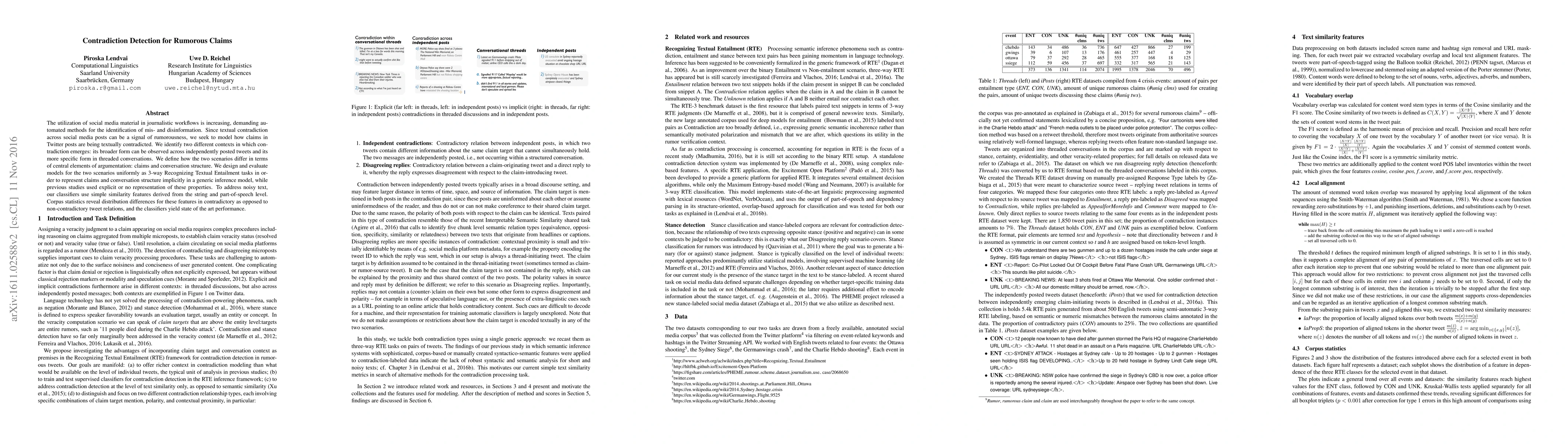 The utilization of social media material in journalistic workflows is increasing, demanding automated methods for the identification of mis- and disinformation. Since textual contradiction across social media posts can be a signal of rumorousness, we seek to model how claims in Twitter posts are being textually contradicted. We identify two different contexts in which contradiction emerges: its broader form can be observed across independently posted tweets and its more specific form in threaded conversations. We define how the two scenarios differ in terms of central elements of argumentation: claims and conversation structure. We design and evaluate models for the two scenarios uniformly as 3-way Recognizing Textual Entailment tasks in order to represent claims and conversation structure implicitly in a generic inference model, while previous studies used explicit or no representation of these properties. To address noisy text, our classifiers use simple similarity features derived from the string and part-of-speech level. Corpus statistics reveal distribution differences for these features in contradictory as opposed to non-contradictory tweet relations, and the classifiers yield state of the art performance.