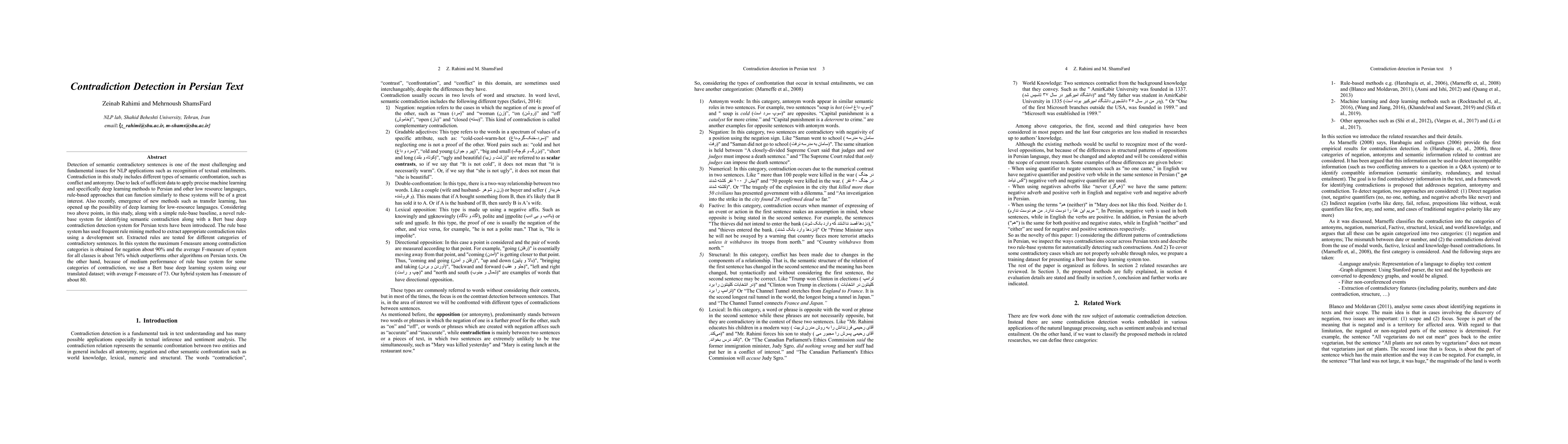 Detection of semantic contradictory sentences is one of the most challenging and fundamental issues for NLP applications such as recognition of textual entailments. Contradiction in this study includes different types of semantic confrontation, such as conflict and antonymy. Due to lack of sufficient data to apply precise machine learning and specifically deep learning methods to Persian and other low resource languages, rule-based approaches that can function similarly to these systems will be of a great interest. Also recently, emergence of new methods such as transfer learning, has opened up the possibility of deep learning for low-resource languages. Considering two above points, in this study, along with a simple rule-base baseline, a novel rule-base system for identifying semantic contradiction along with a Bert base deep contradiction detection system for Persian texts have been introduced. The rule base system has used frequent rule mining method to extract appropriate contradiction rules using a development set. Extracted rules are tested for different categories of contradictory sentences. In this system the maximum f-measure among contradiction categories is obtained for negation about 90% and the average F-measure of system for all classes is about 76% which outperforms other algorithms on Persian texts. On the other hand, because of medium performance of rule base system for some categories of contradiction, we use a Bert base deep learning system using our translated dataset; with average F-measure of 73. Our hybrid system has f-measure of about 80.