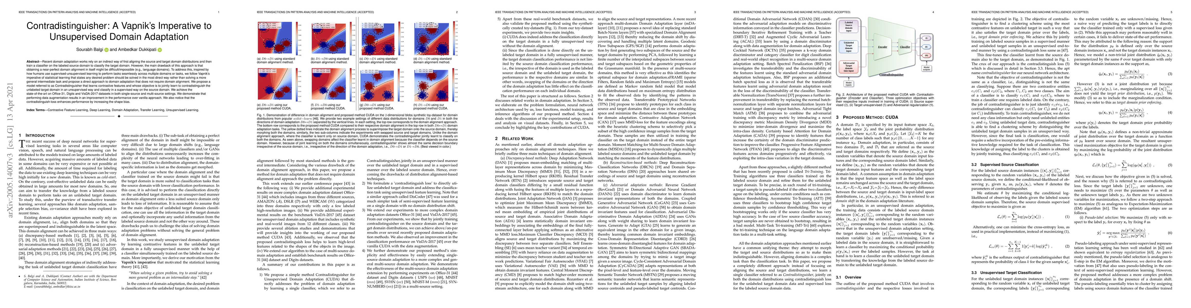 A complex combination of simultaneous supervised-unsupervised learning is believed to be the key to humans performing tasks seamlessly across multiple domains or tasks. This phenomenon of cross-domain learning has been very well studied in domain adaptation literature. Recent domain adaptation works rely on an indirect way of first aligning the source and target domain distributions and then train a classifier on the labeled source domain to classify the target domain. However, this approach has the main drawback that obtaining a near-perfect alignment of the domains in itself might be difficult/impossible (e.g., language domains). To address this, we follow Vapnik's imperative of statistical learning that states any desired problem should be solved in the most direct way rather than solving a more general intermediate task and propose a direct approach to domain adaptation that does not require domain alignment. We propose a model referred Contradistinguisher that learns contrastive features and whose objective is to jointly learn to contradistinguish the unlabeled target domain in an unsupervised way and classify in a supervised way on the source domain. We achieve the state-of-the-art on Office-31 and VisDA-2017 datasets in both single-source and multi-source settings. We also notice that the contradistinguish loss improves the model performance by increasing the shape bias.
