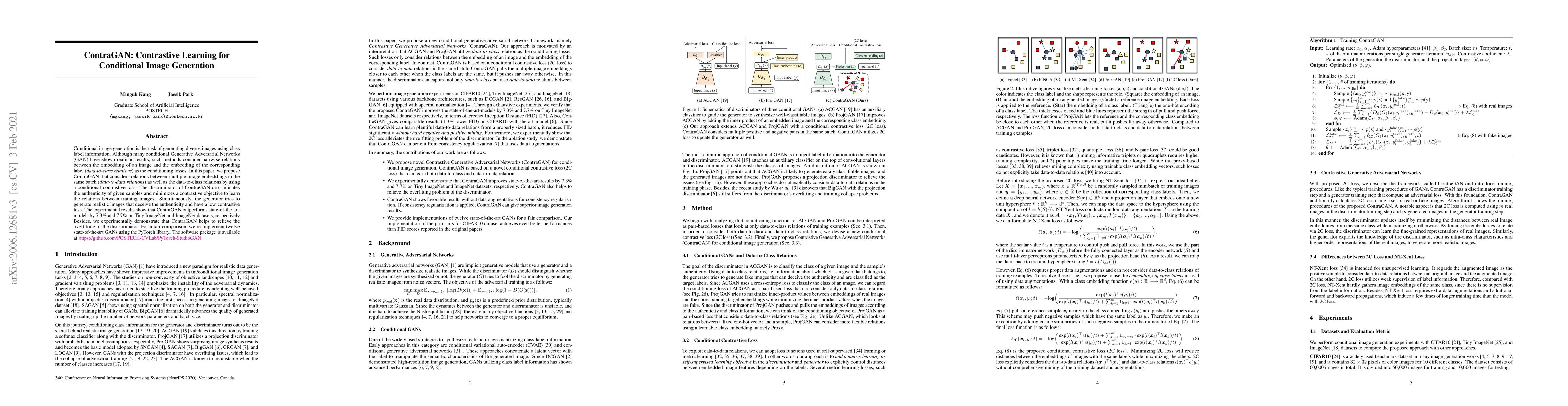 ContraGAN introduces a novel conditional contrastive loss to enhance conditional image generation, improving data-to-data and data-to-class relations. Experimental results show superior performance over state-of-the-art models on Tiny ImageNet and ImageNet, with notable reductions in overfitting.