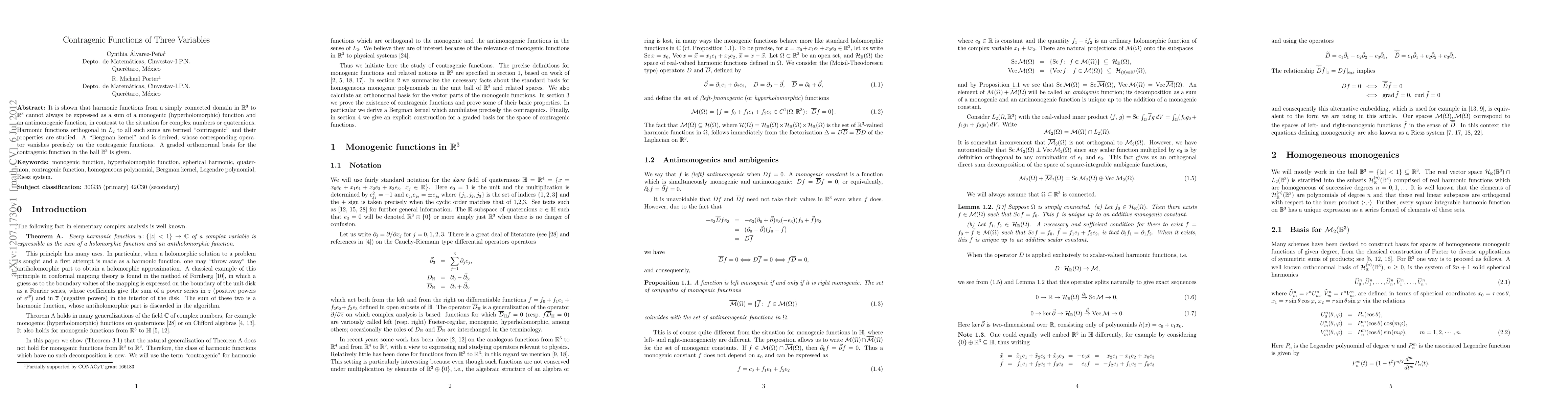It is shown that harmonic functions from a simply connected domain in R^3 to R^3 cannot always be expressed as a sum of a monogenic (hyperholomorphic) function and an antimonogenic function, in contrast to the situation for complex numbers or quaternions. Harmonic functions orthogonal in L_2 to all such sums are termed "contragenic" and their properties are studied. A "Bergman kernel" and is derived, whose corresponding operator vanishes precisely on the contragenic functions. A graded orthonormal basis for the contragenic function in the ball B^3 is given.