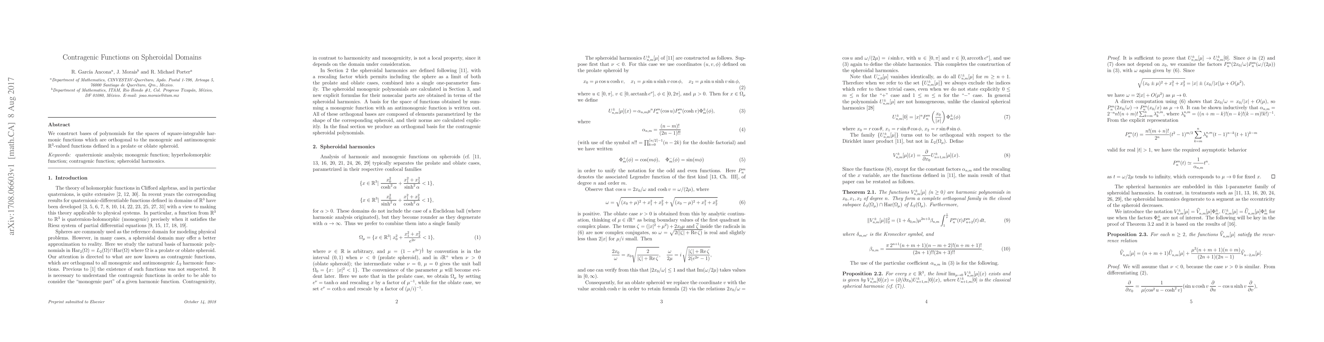We construct bases of polynomials for the spaces of square-integrable harmonic functions which are orthogonal to the monogenic and antimonogenic $\mathbb{R}^3$-valued functions defined in a prolate or oblate spheroid.