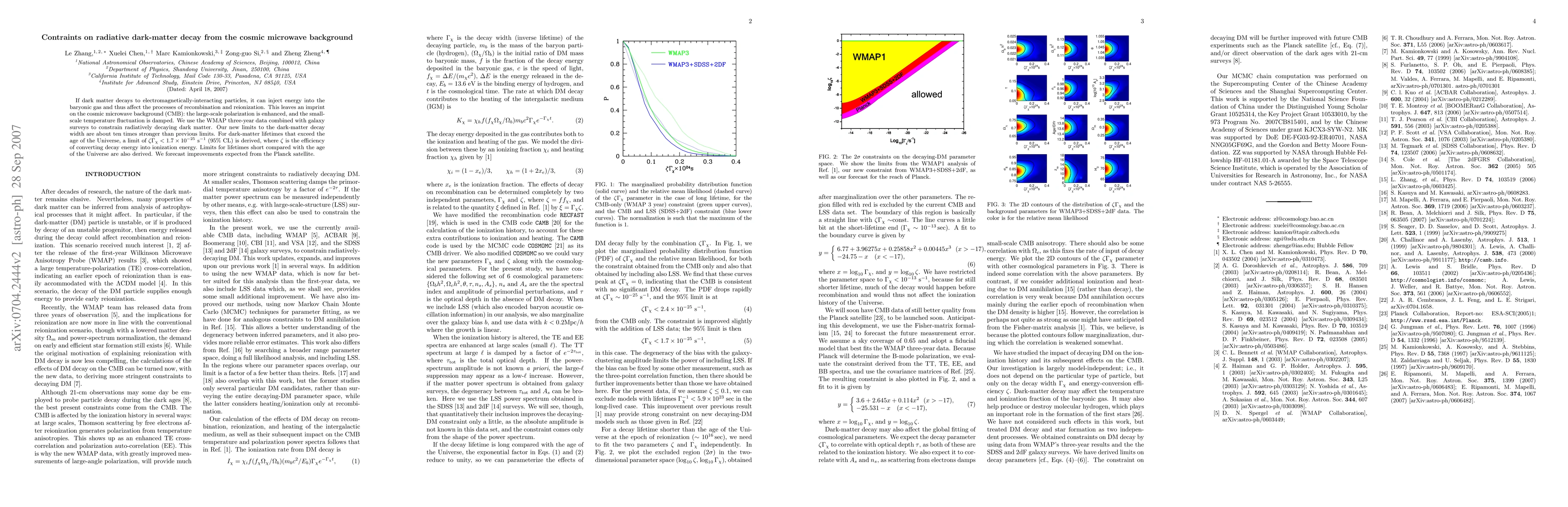 This paper constrains the radiative decay of dark matter by analyzing the effects on the cosmic microwave background (CMB) using WMAP data and galaxy surveys, deriving new limits ten times stronger than previous ones. The study forecasts significant improvements from the upcoming Planck satellite.
