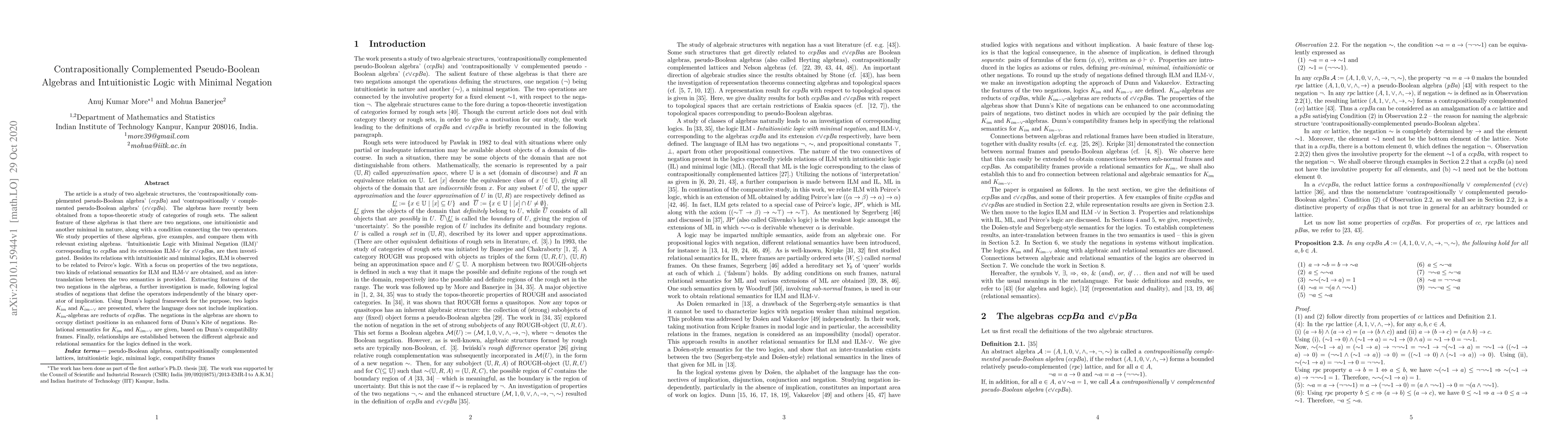 The article is a study of two algebraic structures, the `contrapositionally complemented pseudo-Boolean algebra' (ccpBa) and `contrapositionally $\vee$ complemented pseudo-Boolean algebra' (c$\vee$cpBa). The algebras have recently been obtained from a topos-theoretic study of categories of rough sets. The salient feature of these algebras is that there are two negations, one intuitionistic and another minimal in nature, along with a condition connecting the two operators. We study properties of these algebras, give examples, and compare them with relevant existing algebras. `Intuitionistic Logic with Minimal Negation (ILM)' corresponding to ccpBas and its extension ILM-${\vee}$ for c$\vee$cpBas, are then investigated. Besides its relations with intuitionistic and minimal logics, ILM is observed to be related to Peirce's logic. With a focus on properties of the two negations, two kinds of relational semantics for ILM and ILM-${\vee}$ are obtained, and an inter-translation between the two semantics is provided. Extracting features of the two negations in the algebras, a further investigation is made, following logical studies of negations that define the operators independently of the binary operator of implication. Using Dunn's logical framework for the purpose, two logics $K_{im}$ and $K_{im-{\vee}}$ are presented, where the language does not include implication. $K_{im}$-algebras are reducts of ccpBas. The negations in the algebras are shown to occupy distinct positions in an enhanced form of Dunn's Kite of negations. Relational semantics for $K_{im}$ and $K_{im-{\vee}}$ are given, based on Dunn's compatibility frames. Finally, relationships are established between the different algebraic and relational semantics for the logics defined in the work.