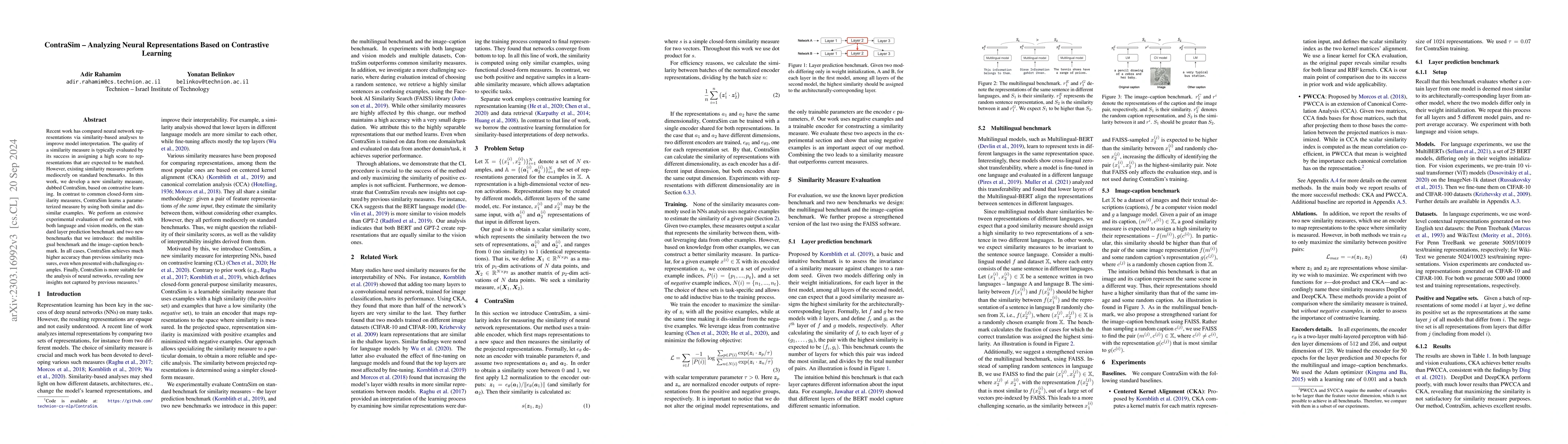 Recent work has compared neural network representations via similarity-based analyses to improve model interpretation. The quality of a similarity measure is typically evaluated by its success in assigning a high score to representations that are expected to be matched. However, existing similarity measures perform mediocrely on standard benchmarks. In this work, we develop a new similarity measure, dubbed ContraSim, based on contrastive learning. In contrast to common closed-form similarity measures, ContraSim learns a parameterized measure by using both similar and dissimilar examples. We perform an extensive experimental evaluation of our method, with both language and vision models, on the standard layer prediction benchmark and two new benchmarks that we introduce: the multilingual benchmark and the image-caption benchmark. In all cases, ContraSim achieves much higher accuracy than previous similarity measures, even when presented with challenging examples. Finally, ContraSim is more suitable for the analysis of neural networks, revealing new insights not captured by previous measures.