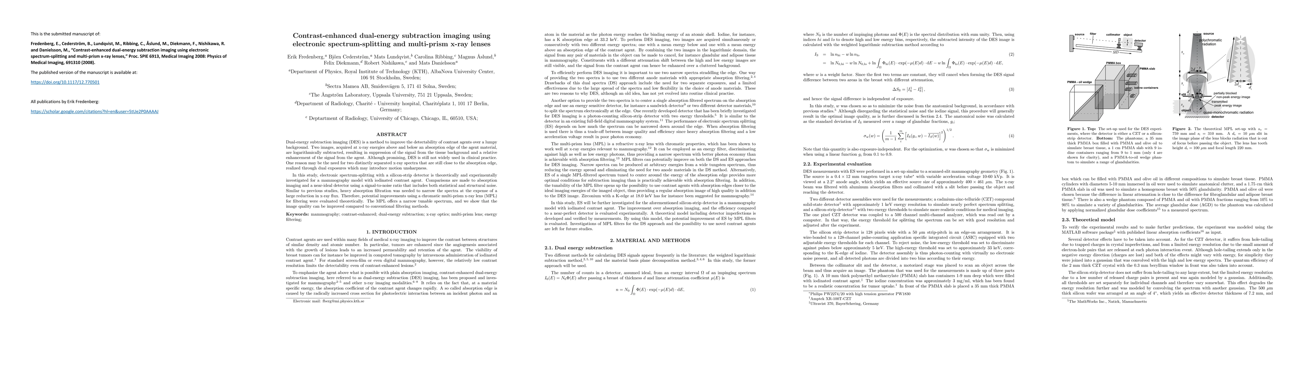 Dual-energy subtraction imaging (DES) is a method to improve the detectability of contrast agents over a lumpy background. Two images, acquired at x-ray energies above and below an absorption edge of the agent material, are logarithmically subtracted, resulting in suppression of the signal from the tissue background and a relative enhancement of the signal from the agent. Although promising, DES is still not widely used in clinical practice. One reason may be the need for two distinctly separated x-ray spectra that are still close to the absorption edge, realized through dual exposures which may introduce motion unsharpness. In this study, electronic spectrum-splitting with a silicon-strip detector is theoretically and experimentally investigated for a mammography model with iodinated contrast agent. Comparisons are made to absorption imaging and a near-ideal detector using a signal-to-noise ratio that includes both statistical and structural noise. Similar to previous studies, heavy absorption filtration was needed to narrow the spectra at the expense of a large reduction in x-ray flux. Therefore, potential improvements using a chromatic multi-prism x-ray lens (MPL) for filtering were evaluated theoretically. The MPL offers a narrow tunable spectrum, and we show that the image quality can be improved compared to conventional filtering methods.