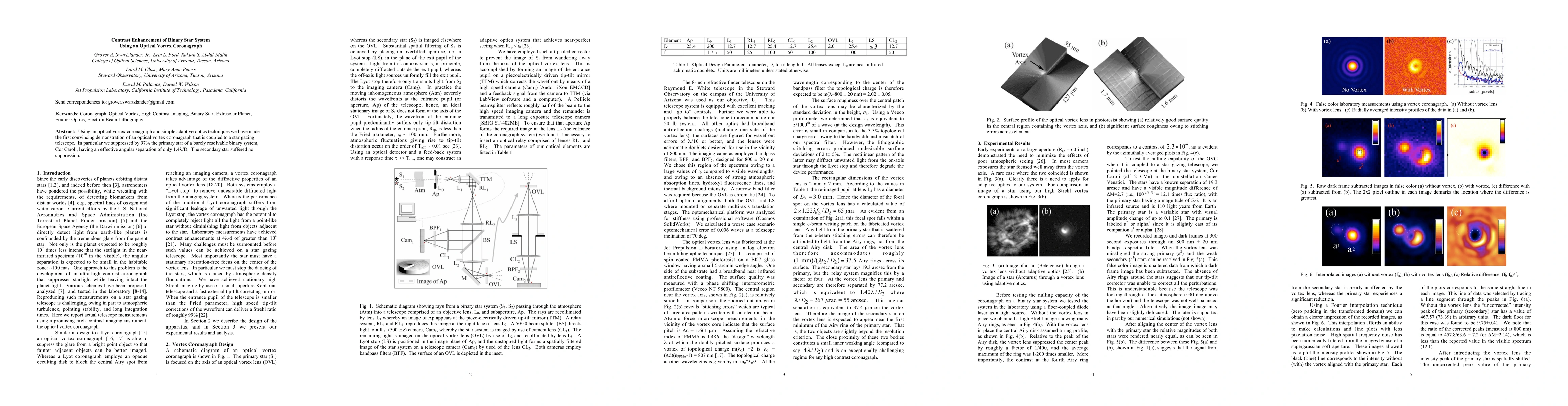 This study demonstrates the use of an optical vortex coronagraph with adaptive optics to achieve 97% suppression of the primary star in the binary system Cor Caroli, revealing the secondary star with minimal interference. This technique effectively enhances contrast in barely resolvable binary star systems.