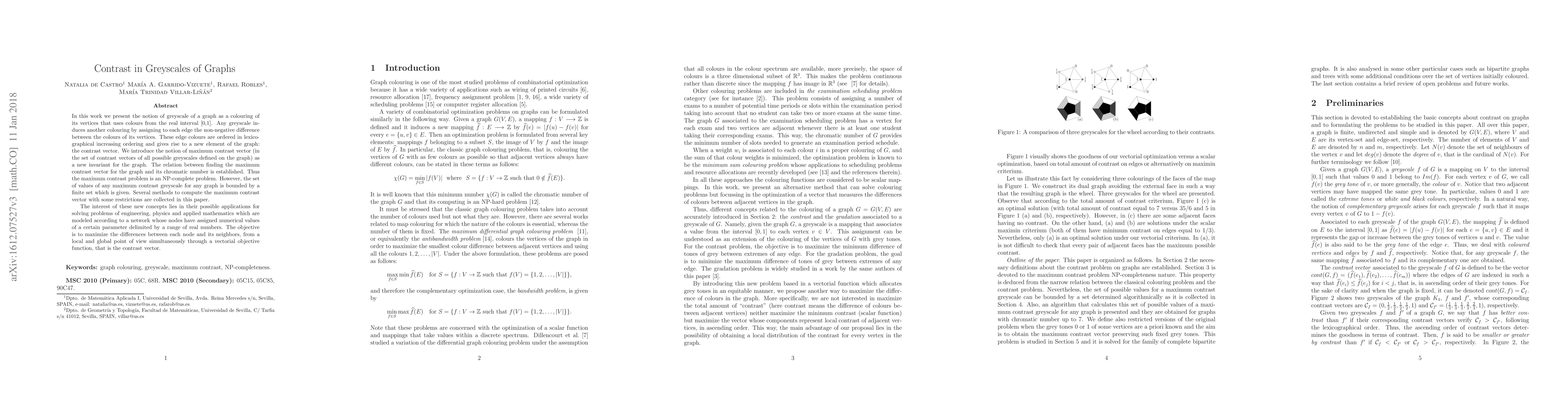A greyscale $f$ of a graph $G(V,E)$ is a mapping from $V$ to the interval $[0,1]$ such that $\{0, 1\} \subseteq Im(f)$. This function $f$ induces another mapping $\widehat{f}$ on $E$ by assigning to each edge the non-negative difference of the values of $f$ on its vertices. The contrast vector $cont(G,f)$ is defined as the vector $(\widehat{f}(e_1), \widehat{f}(e_2), \ldots, \widehat{f}(e_m))$ for all edges $e_i$ of $G$ in such a way that $\widehat{f}(e_i) \leq \widehat{f}(e_{i+1})$ for $i= 1, 2, \dots, m-1$. The concept of maximum contrast vector is presented by using the lexicographical ordering in the set of contrast vectors of all possible greyscales defined on $G$ and a greyscale that gives rise to a maximum contrast vector is named maximum contrast greyscale. The relation between finding the maximum contrast vector for the graph $G$ and the chromatic number of $G$ is established. Thus the maximum contrast problem is an NP-complete problem. However, the set of values of any maximum contrast greyscale for any graph is bounded by a finite set which is given. Several methods to compute the maximum contrast vector with some restrictions in are collected in this paper.