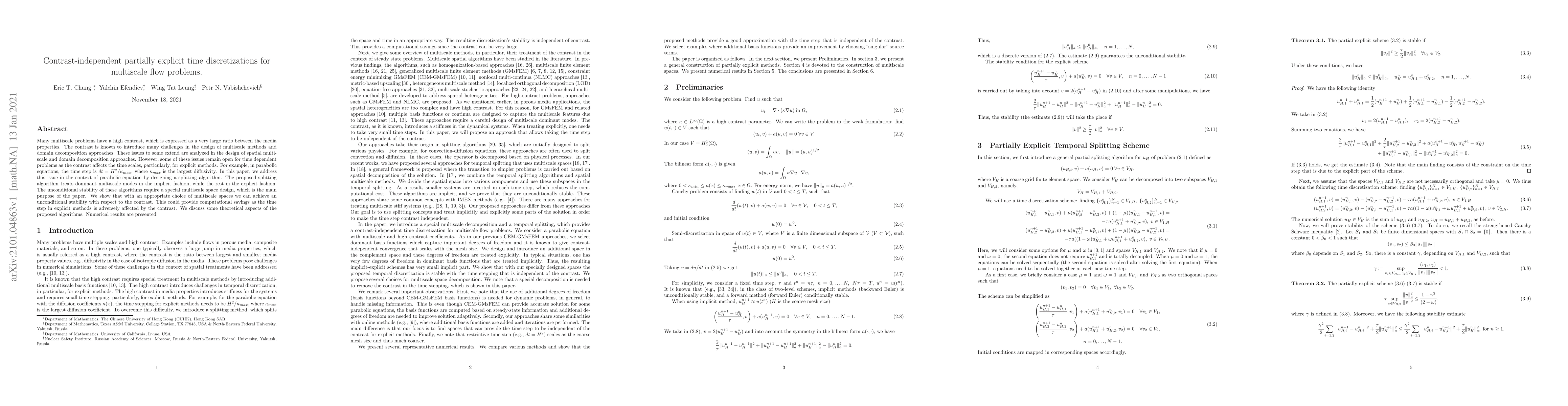 This paper proposes a contrast-independent time discretization method for multiscale flow problems, particularly parabolic equations, by developing a splitting algorithm that implicitly handles dominant multiscale modes and explicitly handles others. The method achieves unconditional stability through a specially designed multiscale space, potentially offering computational savings by mitigating the adverse effects of high contrast on time step size in explicit methods.