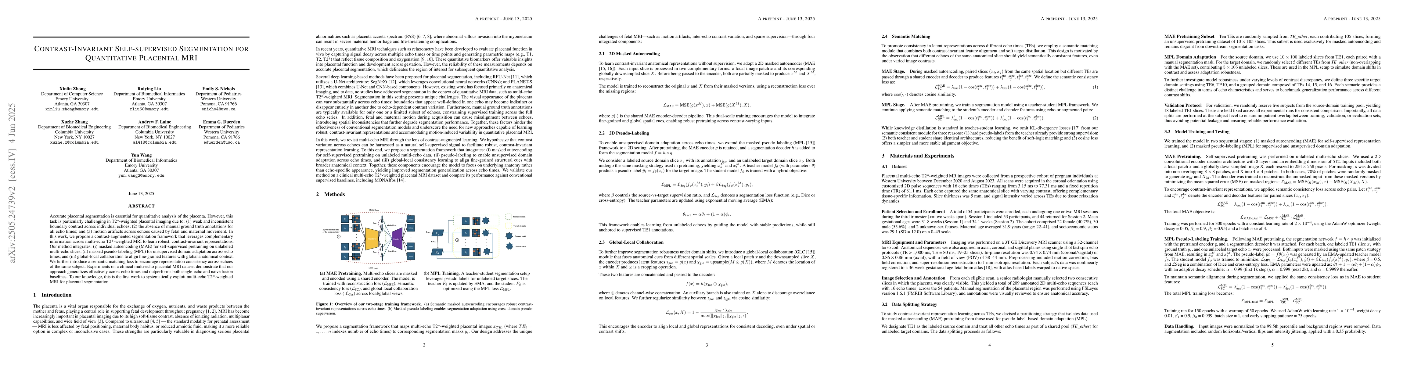 The research proposes a contrast-augmented segmentation framework for placental MRI using masked autoencoding (MAE) for self-supervised pretraining, masked pseudo-labeling (MPL) for unsupervised domain adaptation, and global-local collaboration to align fine-grained features with global context. A semantic matching loss is also introduced to ensure representation consistency across echoes.