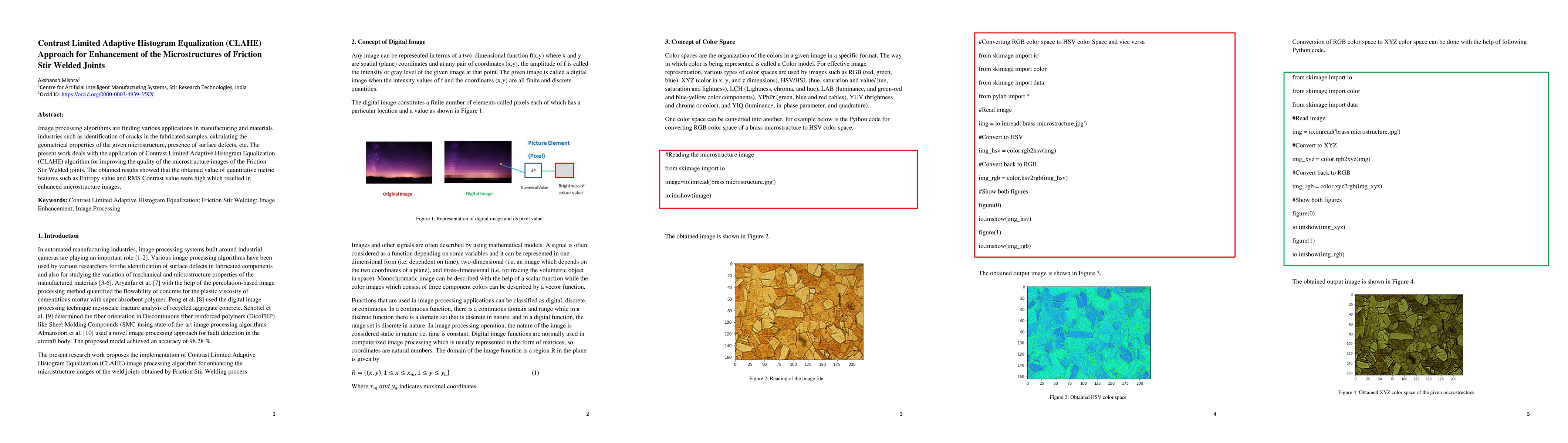 Image processing algorithms are finding various applications in manufacturing and materials industries such as identification of cracks in the fabricated samples, calculating the geometrical properties of the given microstructure, presence of surface defects, etc. The present work deals with the application of Contrast Limited Adaptive Histogram Equalization (CLAHE) algorithm for improving the quality of the microstructure images of the Friction Stir Welded joints. The obtained results showed that the obtained value of quantitative metric features such as Entropy value and RMS Contrast value were high which resulted in enhanced microstructure images.