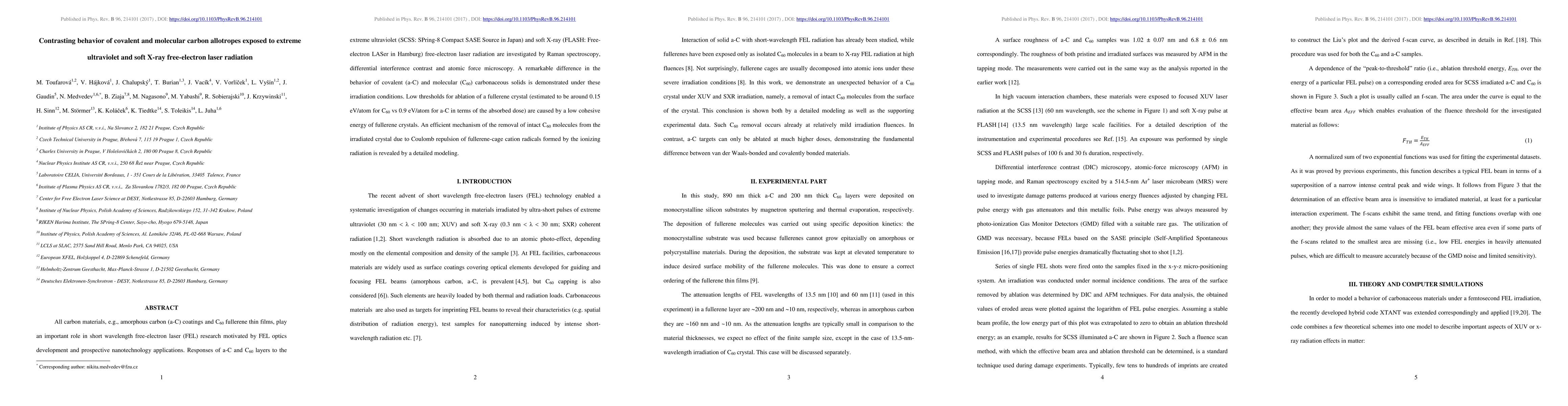 All carbon materials, e.g., amorphous carbon (a-C) coatings and C60 fullerene thin films, play an important role in short-wavelength free-electron laser (FEL) research motivated by FEL optics development and prospective nanotechnology applications. Responses of a-C and C60 layers to the extreme ultraviolet (SPring-8 Compact SASE Source in Japan) and soft x-ray (free-electron laser in Hamburg) free-electron laser radiation are investigated by Raman spectroscopy, differential interference contrast, and atomic force microscopy. A remarkable difference in the behavior of covalent (a-C) and molecular (C60) carbonaceous solids is demonstrated under these irradiation conditions. Low thresholds for ablation of a fullerene crystal (estimated to be around 0.15 eV/atom for C60 vs 0.9 eV/atom for a-C in terms of the absorbed dose) are caused by a low cohesive energy of fullerene crystals. An efficient mechanism of the removal of intact C60 molecules from the irradiated crystal due to Coulomb repulsion of fullerene-cage cation radicals formed by the ionizing radiation is revealed by a detailed modeling.