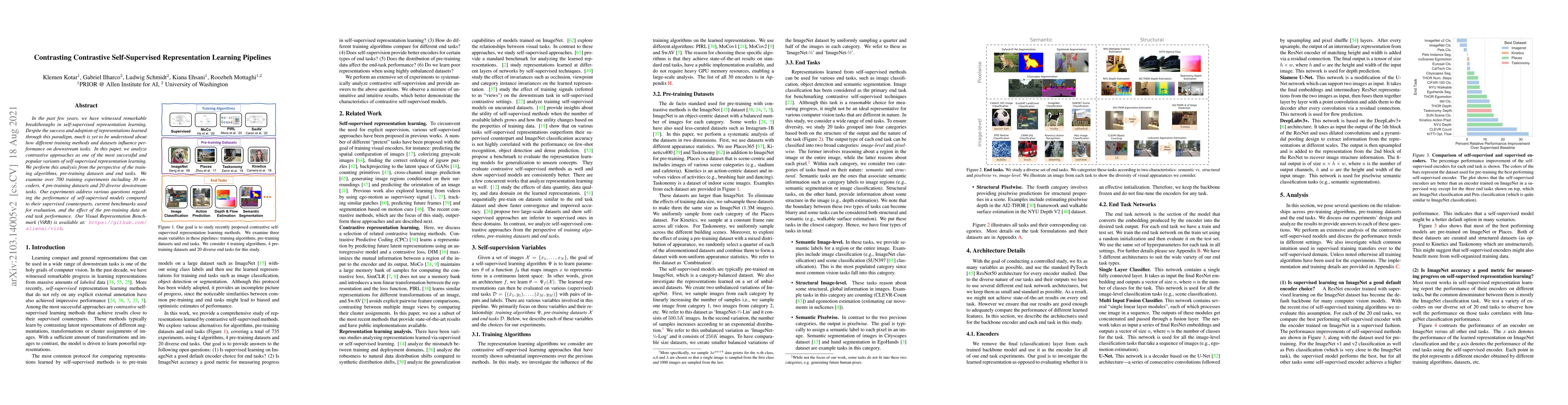 This paper analyzes various contrastive self-supervised learning methods and their impact on downstream tasks, examining over 700 experiments with different encoders, datasets, and tasks. The study aims to understand how training algorithms and pre-training data influence model performance compared to supervised counterparts, and introduces the Visual Representation Benchmark (ViRB) for further research.