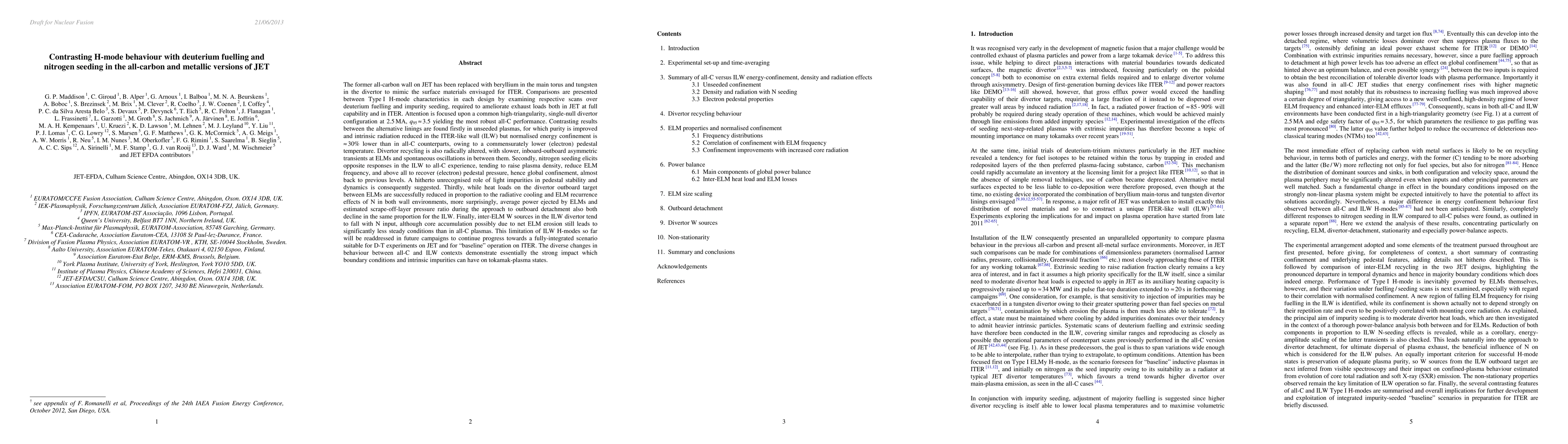 This paper compares the Type I H-mode behaviour in the all-carbon and newly metallic versions of JET, focusing on deuterium fuelling and nitrogen seeding effects to optimize exhaust loads, with the aim of mimicking ITER conditions. Differences in H-mode performance are analyzed to inform future fusion reactor designs.