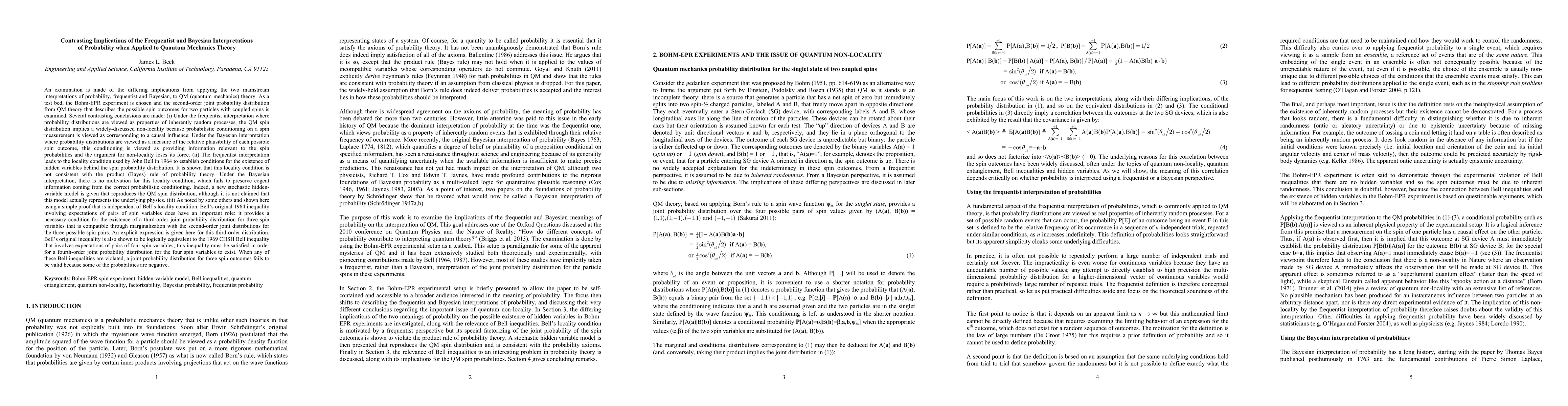 An examination is made of the differing implications from applying the two mainstream interpretations of probability, frequentist and Bayesian, to QM (quantum mechanics) theory for the Bohm-EPR experiment. The joint probability distribution for the possible spin outcomes for two particles with coupled spins is examined. Contrasting conclusions are made: (i) Under the frequentist interpretation, the QM spin distribution implies a widely-discussed non-locality because probabilistic conditioning on a spin measurement is viewed as corresponding to a causal influence. Under the Bayesian interpretation, this conditioning is viewed as providing information relevant to the spin probabilities and the argument for non-locality loses its force. (ii) The frequentist interpretation leads to the locality condition used by John Bell in 1964 to establish conditions for the existence of hidden variables behind the spin probability distribution but this condition is not consistent with the product (Bayes) rule of probability theory. Under the Bayesian interpretation, there is no motivation for this locality condition and a new stochastic hidden-variable model is given that reproduces the spin distribution. (iii) Bell's original 1964 inequality provides a necessary condition for the existence of a third-order joint probability distribution for three spin variables that is compatible through marginalization with the second-order joint distributions for the three possible spin pairs. Bell's inequality is logically equivalent to the 1969 CHSH inequality that involves expectations of four pairs of four spin variables; the CHSH inequality must be satisfied in order for a fourth-order joint probability distribution for the four spin variables to exist. When any of these inequalities are violated, a joint probability distribution for three spin outcomes fails to be valid because some probabilities are negative.