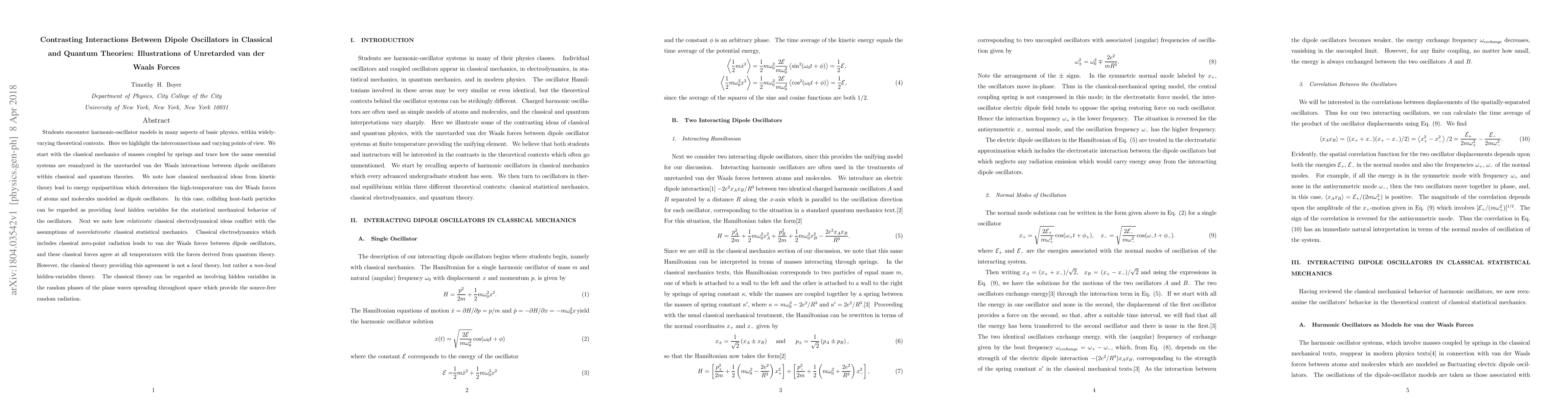 This paper contrasts classical and quantum theories of dipole oscillators, illustrating unretarded van der Waals forces. It shows how classical mechanics and kinetic theory lead to energy equipartition, while classical electrodynamics, including zero-point radiation, aligns with quantum-derived forces through a non-local hidden-variables framework.