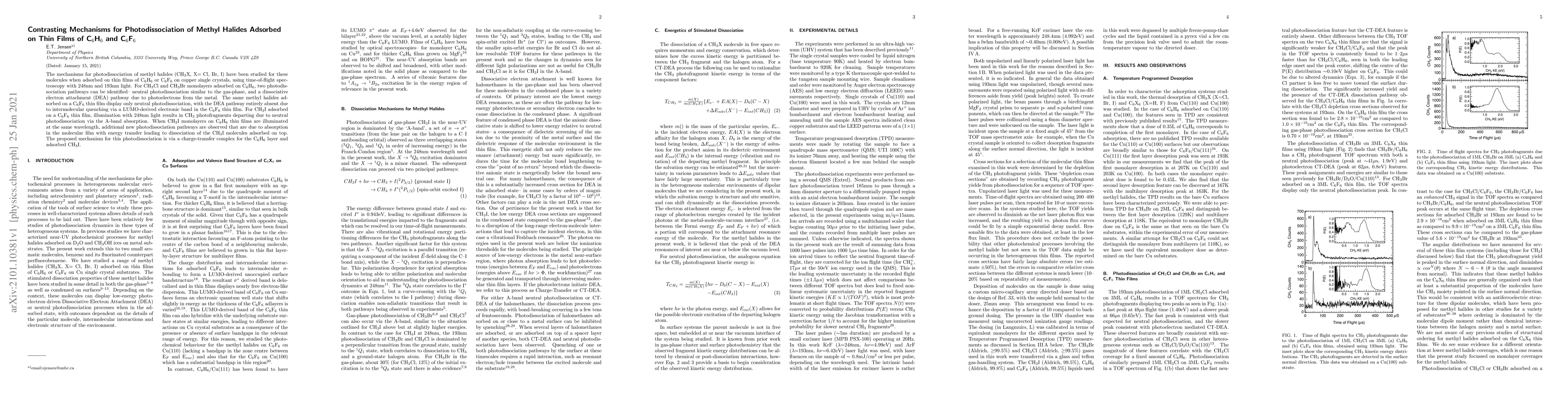 The mechanisms for photodissociation of methyl halides (CH$_3$X, X= Cl, Br, I) have been studied for these molecules when adsorbed on thin films of C$_6$H$_6$ or C$_6$F$_6$ on copper single crystals, using time-of-flight spectroscopy with 248nm and 193nm light. For CH$_3$Cl and CH$_3$Br monolayers adsorbed on C$_6$H$_6$, two photodissociation pathways can be identified: neutral photodissociation similar to the gas-phase, and a dissociative electron attachment (DEA) pathway due to photoelectrons from the metal. The same methyl halides adsorbed on a C$_6$F$_6$ thin film display only neutral photodissociation, with the DEA pathway entirely absent due to intermolecular quenching via a LUMO-derived electronic band in the C$_6$F$_6$ thin film. For CH$_3$I adsorbed on a C$_6$F$_6$ thin film, illumination with 248nm light results in CH$_3$ photofragments departing due to neutral photodissociation via the A-band absorption. When CH$_3$I monolayers on C$_6$H$_6$ thin films are illuminated at the same wavelength, additional new photodissociation pathways are observed that are due to absorption in the molecular film with energy transfer leading to dissociation of the CH$_3$I molecules adsorbed on top. The proposed mechanism for this photodissociation is via a charge-transfer complex for the C$_6$H$_6$ layer and adsorbed CH$_3$I.