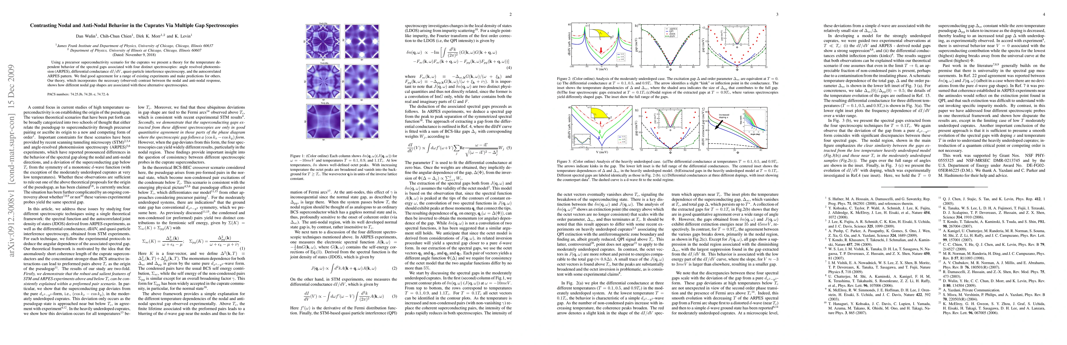 This paper develops a theoretical framework to explain the temperature-dependent spectral gaps in cuprates using four distinct spectroscopies, highlighting the contrast between nodal and anti-nodal behaviors. The theory aligns well with existing experimental data and predicts future observations.