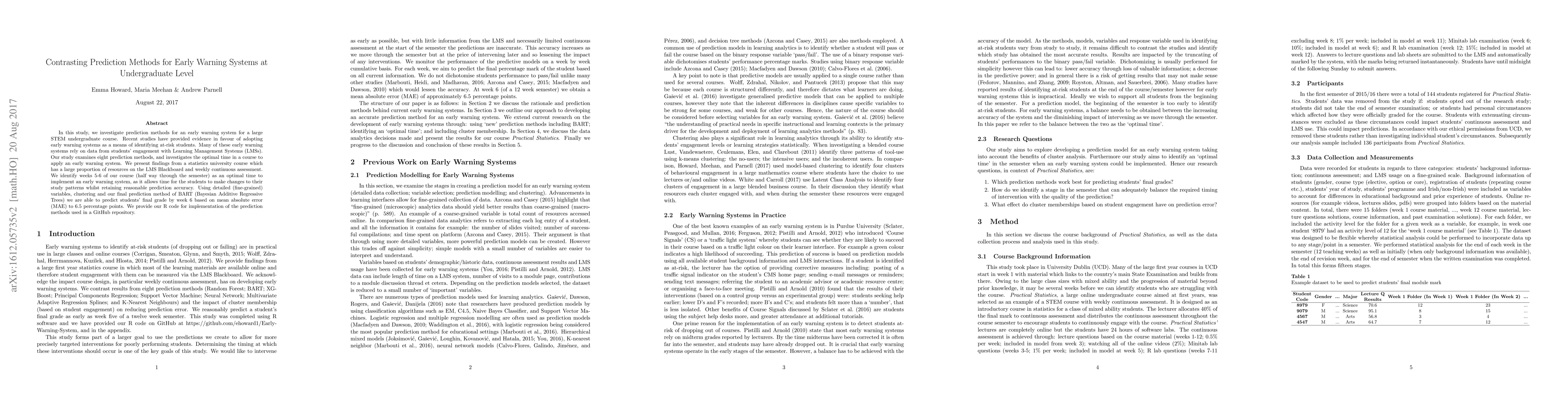 This study evaluates eight prediction methods for an early warning system in a large STEM undergraduate course, finding that weeks 5-6 provide the best timing for implementation. The best-performing BART model predicts final grades with 6.5 percentage point accuracy by week 6, based on LMS engagement data.