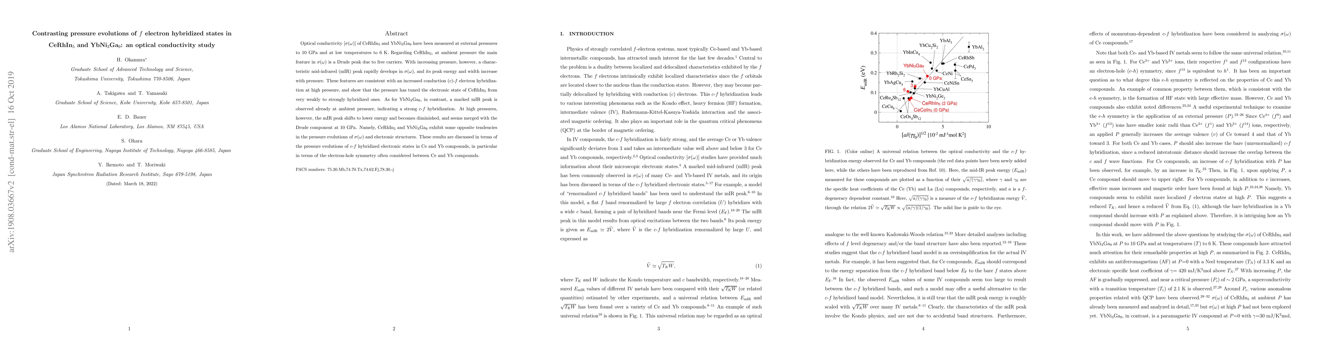 This study investigates the optical conductivity of CeRhIn$_5$ and YbNi$_3$Ga$_9$ under pressure, revealing contrasting $c$-$f$ electron hybridization behaviors. CeRhIn$_5$ shows a transition from weakly to strongly hybridized states with pressure, while YbNi$_3$Ga$_9$ exhibits a shift and reduction of its already strong hybridization peak under pressure.