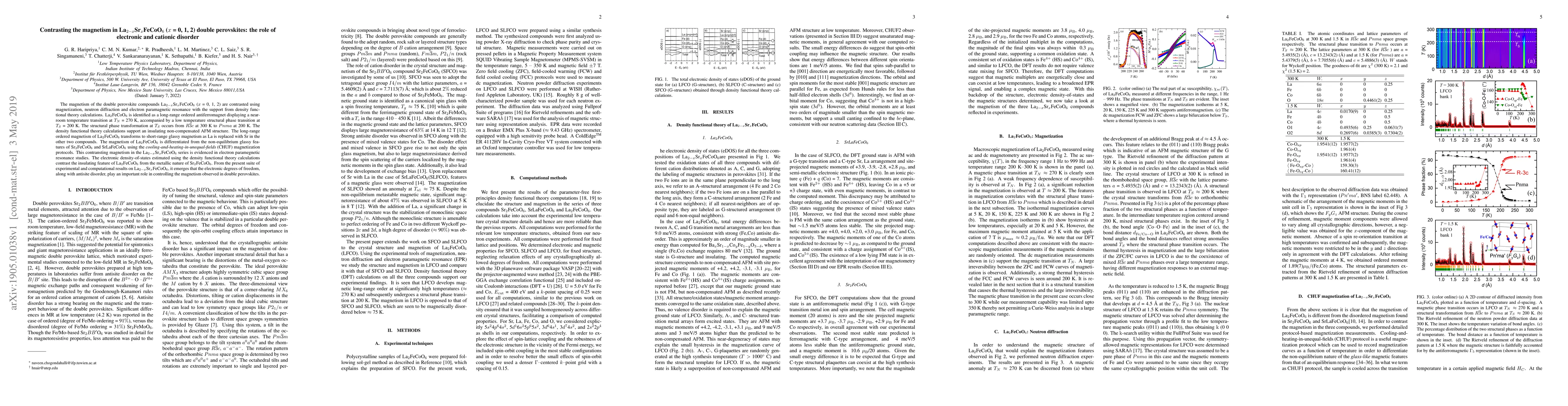 The magnetism of the double perovskite compounds \SLFCOx\ ($x$ = 0, 1, 2) are contrasted using magnetization, neutron diffraction and electron paramagnetic resonance with the support from density functional theory calculations. \LFCO\ is identified as a long-range ordered antiferromagnet displaying a near-room temperature transition at $T_N$ = 270~K, accompanied by a low temperature structural phase transition at $T_S$ = 200~K. The structural phase transformation at $T_S$ occurs from $R\overline{3}c$ at 300~K to $Pnma$ at 200~K. The density functional theory calculations support an insulating non-compensated AFM structure. The long-range ordered magnetism of \LFCO\ transforms to short-range glassy magnetism as La is replaced with Sr in the other two compounds. The magnetism of \LFCO\ is differentiated from the non-equilibrium glassy features of \SFCO\ and \SLFCO\ using the {\em cooling-and-heating-in-unequal-fields} (CHUF) magnetization protocols. This contransting magnetism in the \SLFCOx\ series is evidenced in electron paramegnetic resonance studies. The electronic density-of-states estimated using the density functional theory calculations contrast the insulating feature of \LFCO\ from the metallic nature of \SFCO. From the present suite of experimental and computational results on \SLFCOx, it emerges that the electronic degrees of freedom, along with antisite disorder, play an important role in controlling the magnetism observed in double perovskites.