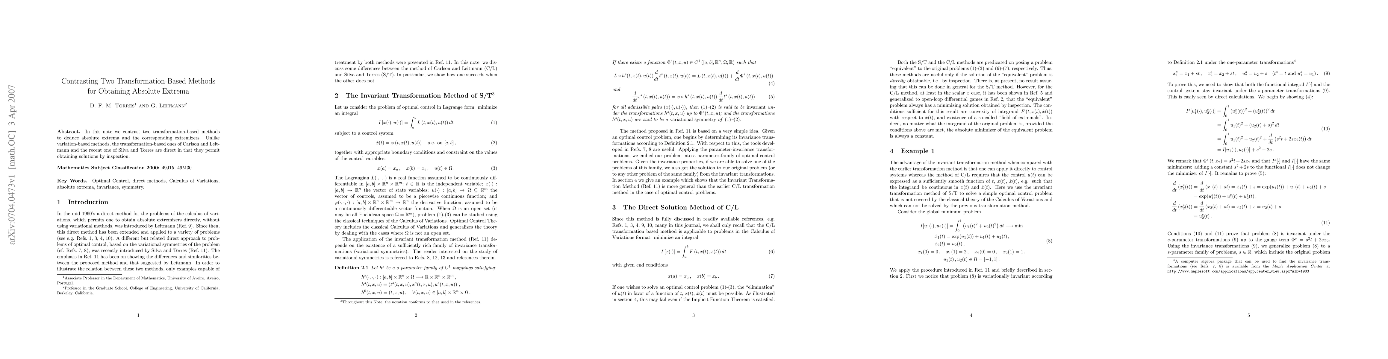 In this note we contrast two transformation-based methods to deduce absolute extrema and the corresponding extremizers. Unlike variation-based methods, the transformation-based ones of Carlson and Leitmann and the recent one of Silva and Torres are direct in that they permit obtaining solutions by inspection.